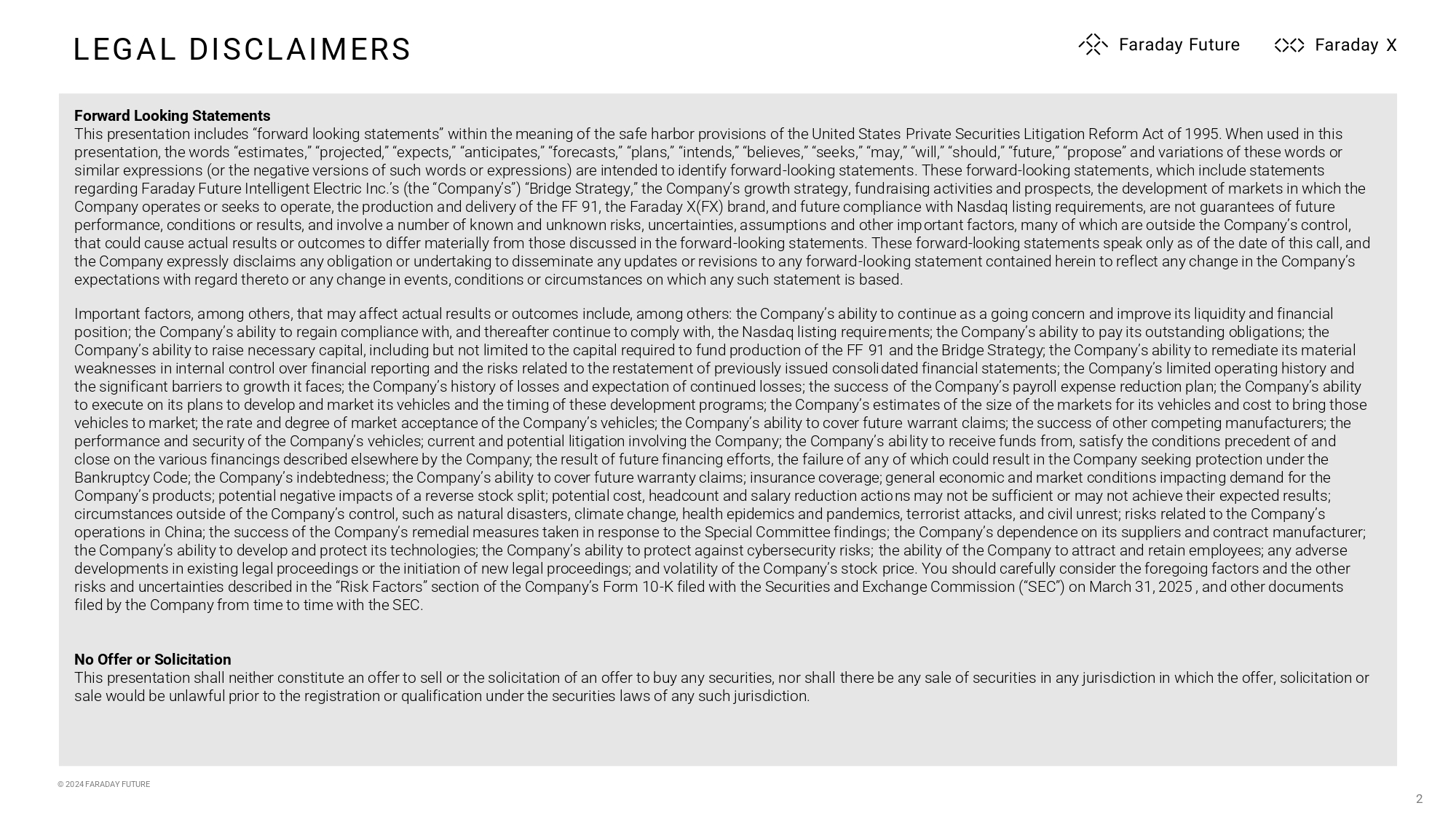 © 2024 FARADAY FUTURE LEGAL DISCLAIMERS 2 Forward Looking Statements This presentation includes “forward looking statements” within the meaning of the safe harbor provisions of the United States Pr ivate Securities Litigation Reform Act of 1995. When used in this presentation, the words “estimates,” “projected,” “expects,” “anticipates,” “forecasts,” “plans,” “intends,” “believes,” “see ks, ” “may,” “will,” “should,” “future,” “propose” and variations of these words or similar expressions (or the negative versions of such words or expressions) are intended to identify forward - looking statements. These forward - looking statements, which include statements regarding Faraday Future Intelligent Electric Inc.’s (the “Company’s”) “Bridge Strategy,” the Company’s growth strategy, fund rai sing activities and prospects, the development of markets in which the Company operates or seeks to operate, the production and delivery of the FF 91, the Faraday X(FX) brand, and future complianc e w ith Nasdaq listing requirements, are not guarantees of future performance, conditions or results, and involve a number of known and unknown risks, uncertainties, assumptions and other imp ort ant factors, many of which are outside the Company’s control, that could cause actual results or outcomes to differ materially from those discussed in the forward - looking statements. These f orward - looking statements speak only as of the date of this call, and the Company expressly disclaims any obligation or undertaking to disseminate any updates or revisions to any forward - looking sta tement contained herein to reflect any change in the Company’s expectations with regard thereto or any change in events, conditions or circumstances on which any such statement is based. Important factors, among others, that may affect actual results or outcomes include, among others: the Company’s ability to c ont inue as a going concern and improve its liquidity and financial position; the Company’s ability to regain compliance with, and thereafter continue to comply with, the Nasdaq listing require men ts; the Company’s ability to pay its outstanding obligations; the Company’s ability to raise necessary capital, including but not limited to the capital required to fund production of the FF 91 and the Bridge Strategy; the Company’s ability to remediate its material weaknesses in internal control over financial reporting and the risks related to the restatement of previously issued consoli dat ed financial statements; the Company’s limited operating history and the significant barriers to growth it faces; the Company’s history of losses and expectation of continued losses; the success of the Company’s payroll expense reduction plan; the Company’s ability to execute on its plans to develop and market its vehicles and the timing of these development programs; the Company’s estima tes of the size of the markets for its vehicles and cost to bring those vehicles to market; the rate and degree of market acceptance of the Company’s vehicles; the Company’s ability to cover future wa rrant claims; the success of other competing manufacturers; the performance and security of the Company’s vehicles; current and potential litigation involving the Company; the Company’s abi lit y to receive funds from, satisfy the conditions precedent of and close on the various financings described elsewhere by the Company; the result of future financing efforts, the failure of an y o f which could result in the Company seeking protection under the Bankruptcy Code; the Company’s indebtedness; the Company’s ability to cover future warranty claims; insurance coverage; gener al economic and market conditions impacting demand for the Company’s products; potential negative impacts of a reverse stock split; potential cost, headcount and salary reduction actio ns may not be sufficient or may not achieve their expected results; circumstances outside of the Company’s control, such as natural disasters, climate change, health epidemics and pandemics, te rro rist attacks, and civil unrest; risks related to the Company’s operations in China; the success of the Company’s remedial measures taken in response to the Special Committee findings; the Company’s dependence on its suppliers and contract manufacturer; the Company’s ability to develop and protect its technologies; the Company’s ability to protect against cybersecurity risks; the ability of the Company to attract and retain employees; any adverse developments in existing legal proceedings or the initiation of new legal proceedings; and volatility of the Company’s stock pri ce. You should carefully consider the foregoing factors and the other risks and uncertainties described in the “Risk Factors” section of the Company’s Form 10 - K filed with the Securities and Exchang e Commission (“SEC”) on March 31, 2025 , and other documents filed by the Company from time to time with the SEC. No Offer or Solicitation This presentation shall neither constitute an offer to sell or the solicitation of an offer to buy any securities, nor shall the re be any sale of securities in any jurisdiction in which the offer, solicitation or sale would be unlawful prior to the registration or qualification under the securities laws of any such jurisdiction.