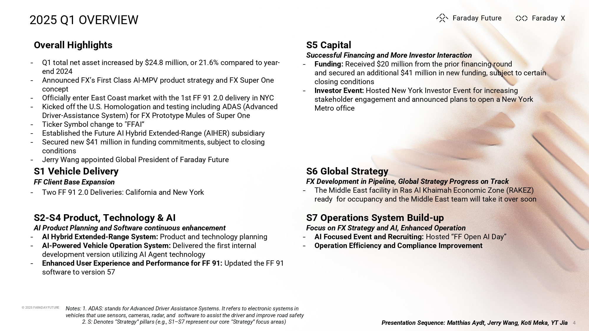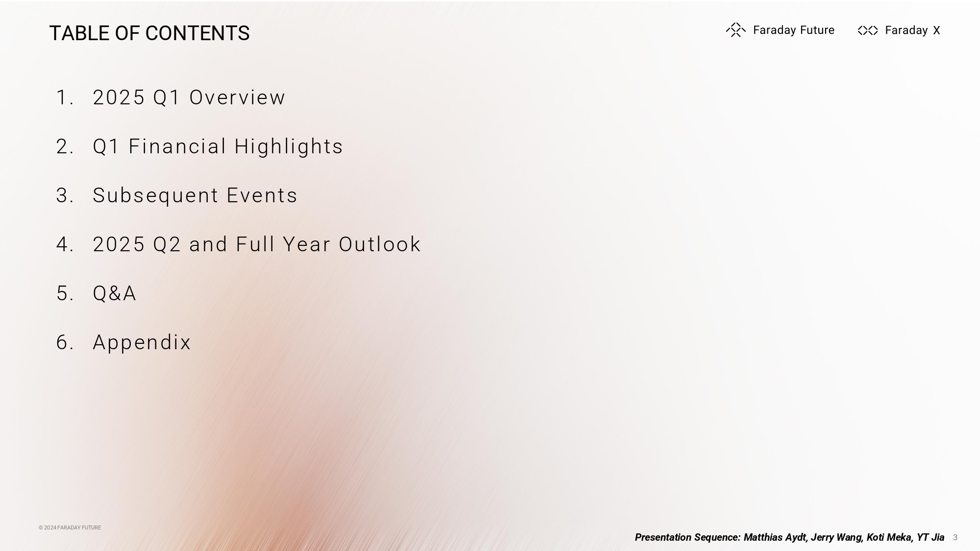 © 2024 FARADAY FUTURE TABLE OF CONTENTS 3 1. 2025 Q1 Overview 2. Q1 Financial Highlights 3. Subsequent Events 4. 2025 Q2 and Full Year Outlook 5. Q&A 6. Appendix © 2024 FARADAY FUTURE Presentation Sequence: Matthias Aydt, Jerry Wang, Koti Meka, YT Jia