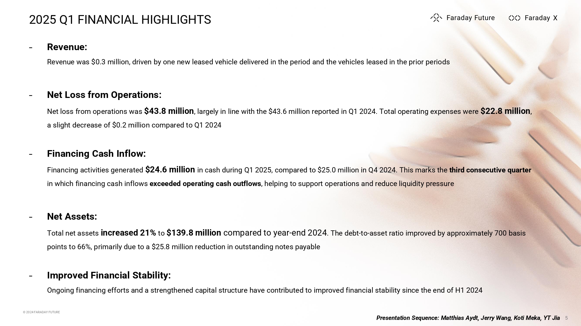 © 2024 FARADAY FUTURE 4 S1 Vehicle Delivery FF Client Base Expansion ̵ Two FF 91 2.0 Deliveries: California and New York S2 - S4 Product, Technology & AI AI Product Planning and Software continuous enhancement ̵ AI Hybrid Extended - Range System: Product and technology planning ̵ AI - Powered Vehicle Operation System: Delivered the first internal development version utilizing AI Agent technology ̵ Enhanced User Experience and Performance for FF 91: Updated the FF 91 software to version 57 © 2025 FARADAY FUTURE 2025 Q1 OVERVIEW Overall H ighlights ̵ Q1 total net asset increased by $24.8 million, or 21.6 % compared to year - end 2024 ̵ Announced FX’s First Class AI - MPV product s trategy and FX Super One concept ̵ Officially enter East Coast market with the 1st FF 91 2.0 delivery in NYC ̵ Kicked off the U.S. Homologation and testing including ADAS (Advanced Driver - Assistance System) for FX Prototype Mules of Super One ̵ Ticker Symbol change to "FFAI“ ̵ Established the Future AI Hybrid Extended - Range (AIHER) subsidiary ̵ Secured new $41 million in funding commitments, subject to closing conditions ̵ Jerry Wang appointed Global President of Faraday Future Notes: 1. ADAS: stands for Advanced Driver Assistance Systems. It refers to electronic systems in vehicles that use sensors, cameras, radar, and software to assist the driver and improve road safety 2. S: Denotes “Strategy” pillars (e.g., S1 – S7 represent our core “Strategy” focus areas) Presentation Sequence: Matthias Aydt, Jerry Wang, Koti Meka, YT Jia S6 Global Strategy FX Development in Pipeline, Global Strategy Progress on Track ̵ The Middle East facility in Ras Al Khaimah Economic Zone (RAKEZ) ready for occupancy and the Middle East team will take it over soon S7 Operatio ns System Build - up Focus on FX Strategy and AI, Enhanced Operation ̵ AI Focused Event and Recruiting: Hosted “FF Open AI Day” ̵ Operation E fficiency and Compliance Improvement S5 Capital Successful Financing and More Investor Interaction ̵ Funding: Received $20 million from the prior financing round and secured an additional $41 million in new funding, subject to certain closing conditions ̵ Investor Event: Hosted New York Investor Event for increasing stakeholder engagement and announced plans to open a New York Metro office