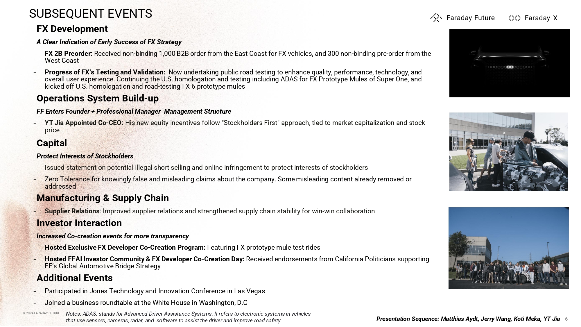 © 2024 FARADAY FUTURE SUBSEQUENT EVENTS FX Development A Clear Indication of Early Success of FX Strategy ̵ FX 2B Preorder: Received non - binding 1,000 B2B order from the East Coast for FX vehicles, and 300 non - binding pre - order from the West Coast ̵ Progress of FX’s Testing and Validation: N ow undertaking public road testing to e nhance quality, performance, technology, and overall user experience. Continuing the U.S. homologation and testing including ADAS for FX Prototype Mules of S uper One, and k icked off U.S. homologation and road - testing FX 6 prototype mules O perations System Build - up FF Enters Founder + Professional Manager Management Structure ̵ YT Jia Appointed Co - CEO: H is new equity incentives follow "Stockholders First" approach, tied to market capitalization and stock price Capital Protect Interests of Stockholders ̵ Issued statement on potential illegal short selling and online infringement to protect interests of stockholders ̵ Zero Tolerance for knowingly false and misleading claims about the company. Some misleading content already removed or addressed Manufacturing & Supply Chain ̵ Supplier Relations : Improved supplier relations and strengthened supply chain stability for win - win collaboration Investor Interaction Increased Co - creation events for more transparency ̵ Hosted Exclusive FX Developer Co - Creation Program: Featuring FX prototype mule test rides ̵ Hosted FFAI Investor Community & FX Developer Co - Creation Day: Received endorsements from California Politicians supporting FF’s Global Automotive Bridge Strategy Additional Events ̵ Participated in Jones Technology and Innovation Conference in Las Vegas ̵ Joined a business roundtable at the White House in Washington, D.C © 2024 FARADAY FUTURE 6 Presentation Sequence: Matthias Aydt, Jerry Wang, Koti Meka, YT Jia Notes: ADAS: stands for Advanced Driver Assistance Systems. It refers to electronic systems in vehicles that use sensors, cameras, radar, and software to assist the driver and improve road safety