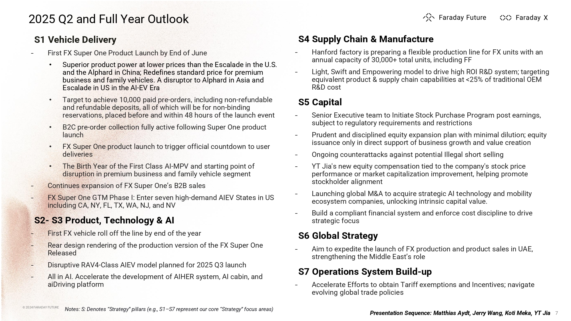 © 2024 FARADAY FUTURE 2025 Q2 and Full Year Outlook S1 Vehicle Delivery ̵ First FX Super One Product Launch by End of June • Superior product power at lower prices than the Escalade in the U.S. and the Alphard in China; Redefines s tandard price for premium business and family vehicles. A disruptor to Alphard in Asia and Escalade in US in the AI - EV Era • Target to achieve 10,000 paid pre - orders, including non - refundable and refundable deposits, all of which will be for non - binding reservations, placed before and within 48 hours of the launch event • B2C pre - order collection fully active following Super One product launch • FX Super One product launch to trigger official countdown to user deliveries • The Birth Year of the First Class AI - MPV and starting point of disruption in premium business and family vehicle segment ̵ Continues expansion of FX Super One’s B2B sales ̵ FX Super One GTM Phase I: Enter seven high - demand AIEV States in US including CA, NY, FL, TX, WA, NJ, and NV S2 - S3 Product, Technology & AI ̵ First FX vehicle roll off the line by end of the year ̵ Rear design rendering of the production version of the FX Super One Released ̵ Disruptive RAV4 - Class AIEV model planned for 2025 Q3 launch ̵ All in AI. Accelerate the development of AIHER system, AI cabin, and aiDriving platform © 2024 FARADAY FUTURE 7 S4 Supply Chain & M anufacture ̵ Hanford factory is preparing a flexible production line for FX units with an annual capacity of 30,000+ total units, including FF ̵ Light, Swift and Empowering model to drive high ROI R&D system; targeting equivalent product & supply chain capabilities at <25% of traditional OEM R&D cost S5 Capital ̵ Senior Executive team to Initiate Stock Purchase Program post earnings, subject to regulatory requirements and restrictions ̵ Prudent and disciplined equity expansion plan with minimal dilution; equity issuance only in direct support of business growth and value creation ̵ Ongoing counterattacks against potential Illegal short selling ̵ YT Jia's new equity compensation tied to the company's stock price performance or market capitalization improvement, helping promote stockholder alignment ̵ Launching global M&A to acquire strategic AI technology and mobility ecosystem companies, unlocking intrinsic capital value. ̵ Build a compliant financial system and enforce cost discipline to drive strategic focus S6 Global Strategy ̵ Aim to expedite the launch of FX production and product sales in UAE, strengthening the Middle East’s role S7 Operations System Build - up ̵ Accelerate Efforts to obtain Tariff exemptions and Incentives; navigate evolving global trade policies Presentation Sequence: Matthias Aydt, Jerry Wang, Koti Meka, YT Jia Notes: S: Denotes “Strategy” pillars (e.g., S1 – S7 represent our core “Strategy” focus areas)