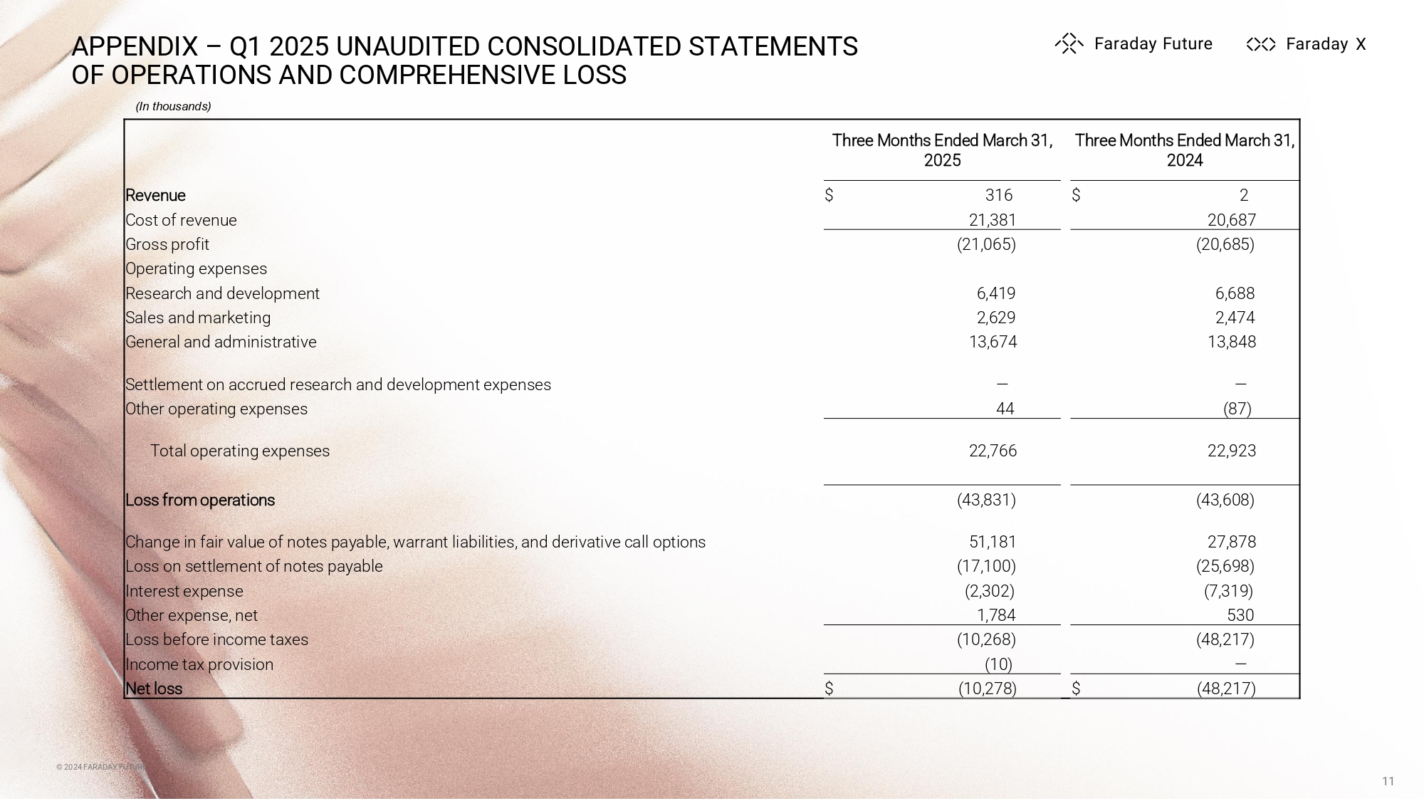 © 2024 FARADAY FUTURE APPENDIX – Q1 2025 UNAUDITED CONSOLIDATED BALANCE SHEETS (In thousands) © 2024 FARADAY FUTURE 10 December 31, 2024 March 31, 2025 Assets $ 7,174 $ 9,493 Cash and restricted cash 27,486 27,124 Inventory, net 37,221 39,854 Deposits and other current assets 71,881 76,471 Total current assets 348,587 331,465 Property, plant and equipment, net 1,761 1,208 Operating lease right - of - use asset, net 3,171 1,440 Other non - current assets $ 425,400 $ 410,584 Total assets Liabilities and stockholders’ equity $ 71,414 $ 70,697 Accounts payable 56,754 61,492 Accrued expenses and other current liabilities 28,864 23,624 Warrant liabilities 23,252 22,368 Accrued interest 761 803 Other financing liabilities, current portion 2,128 1,364 Operating lease liabilities, current portion 9,534 8,430 Notes payable 192,707 188,778 Total current liabilities 38,698 40,489 Other financing liabilities, long term portion 14 10 Operating lease liabilities, less current portion 48,018 23,367 Notes payable, less current portion and other liabilities 29,709 17,057 Derivative call options 1,287 1,075 Other liabilities 310,433 270,776 Total liabilities Stockholders' equity 6 8 Class A Common Stock, 0.0001 par value — — Class B Common Stock, 0.0001 par value — — Preferred Stock, 0.0001 par value 4,421,563 4,456,374 Additional paid - in capital 7,744 8,050 Accumulated other comprehensive income (4,314,346) (4,324,624) Accumulated deficit 114,967 139,808 Total stockholders' equity $ 425,400 $ 410,584 Total liabilities and stockholders’ equity