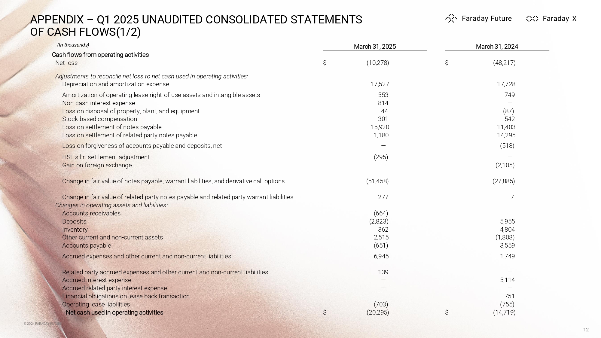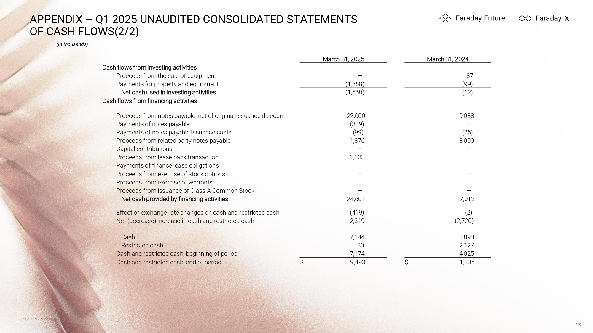 © 2024 FARADAY FUTURE APPENDIX – Q1 2025 UNAUDITED CONSOLIDATED STATEMENTS OF CASH FLOWS(1/2) © 2024 FARADAY FUTURE 12 March 31, 2024 March 31, 2025 Cash flows from operating activities $ (48,217) $ (10,278) Net loss Adjustments to reconcile net loss to net cash used in operating activities: 17,728 17,527 Depreciation and amortization expense 749 553 Amortization of operating lease right - of - use assets and intangible assets — 814 Non - cash interest expense (87) 44 Loss on disposal of property, plant, and equipment 542 301 Stock - based compensation 11,403 15,920 Loss on settlement of notes payable 14,295 1,180 Loss on settlement of related party notes payable (518) — Loss on forgiveness of accounts payable and deposits, net — (295) HSL s.l.r. settlement adjustment (2,105) — Gain on foreign exchange (27,885) (51,458) Change in fair value of notes payable, warrant liabilities, and derivative call options 7 277 Change in fair value of related party notes payable and related party warrant liabilities Changes in operating assets and liabilities: — (664) Accounts receivables 5,955 (2,823) Deposits 4,804 362 Inventory (1,808) 2,515 Other current and non - current assets 3,559 (651) Accounts payable 1,749 6,945 Accrued expenses and other current and non - current liabilities — 139 Related party accrued expenses and other current and non - current liabilities 5,114 — Accrued interest expense — — Accrued related party interest expense 751 — Financial obligations on lease back transaction (755) (703) Operating lease liabilities $ (14,719) $ (20,295) Net cash used in operating activities (In thousands)