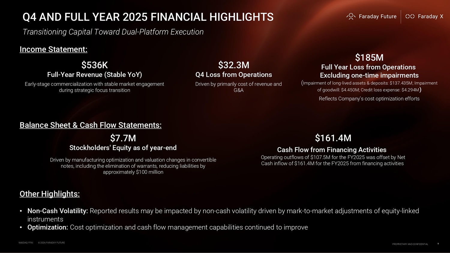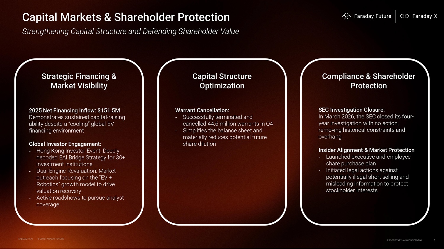 Q4 AND FULL YEAR 2025 FINANCIAL HIGHLIGHTS Other Highlights: • Non - Cash Volatility: Reported results may be impacted by non - cash volatility driven by mark - to - market adjustments of equity - linked instruments • Optimization: Cost optimization and cash flow management capabilities continued to improve Income Statement: $536K Full - Year Revenue (Stable YoY) Early - stage commercialization with stable market engagement during strategic focus transition $32.3M Q4 Loss from Operations Driven by primarily cost of revenue and G&A $185M Full Year Loss from Operations Excluding one - time impairments ( Impairment of long - lived assets & deposits: $137.435M; Impairment of goodwill: $4.450M; Credit loss expense: $4.294M ) Reflects Company’s cost optimization efforts Balance Sheet & Cash Flow Statements: $7.7M Stockholders' Equity as of year - end Driven by manufacturing optimization and valuation changes in convertible notes, including the elimination of warrants, reducing liabilities by approximately $100 million $161.4M Cash Flow from Financing Activities Operating outflows of $107.5M for the FY2025 was offset by Net Cash inflow of $161.4M for the FY2025 from financing activities Transitioning Capital To ard Dual - Platform Execution NASDAQ: FFAI © 2026 FARADAY FUTURE PROPRIETARY AND CONFIDENTIAL 9