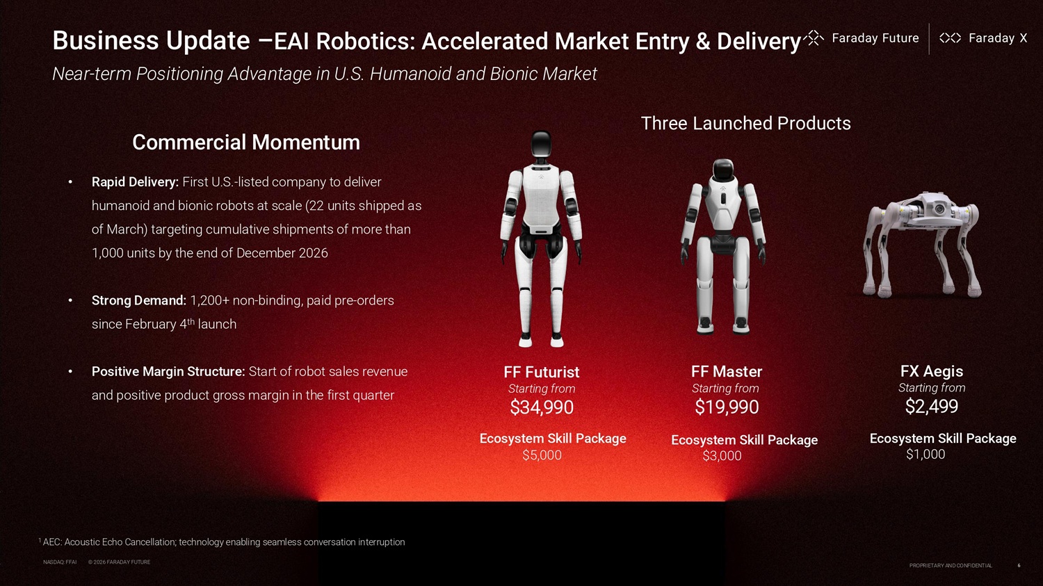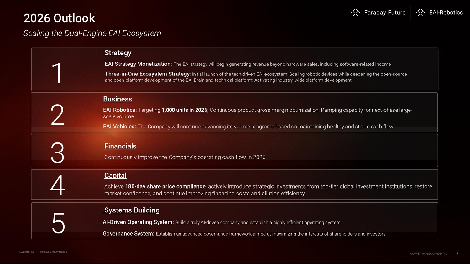 Business EAI Robotics: Targeting 1,000 units in 2026; Continuous product gross margin optimization; Ramping capacity for next - phase large - scale volume. EAI Vehicles: The Company will continue advancing its vehicle programs based on maintaining healthy and stable cash flow 2026 Outlook Scaling the Dual - Engine EAI Ecosystem Systems Building AI - Driven Operating System: Build a truly AI - driven company and establish a highly efficient operating system Governance System: Establish an advanced governance framework aimed at maximizing the interests of shareholders and investors Capital Achieve 180 - day share price compliance, actively introduce strategic investments from top - tier global investment institutions, restore market confidence, and continue improving financing costs and dilution efficiency. Financials Continuously improve the Company’s operating cash flow in 2026. Strategy EAI Strategy Monetization: The EAI strategy will begin generating revenue beyond hardware sales, including software - related income Three - in - One Ecosystem Strategy : Initial launch of the tech - driven EAI ecosystem; Scaling robotic devices while deepening the open - source and open - platform development of the EAI Brain and technical platform; Activating industry - wide platform development. NASDAQ: FFAI © 2026 FARADAY FUTURE PROPRIETARY AND CONFIDENTIAL 11 3 4 5 1 2