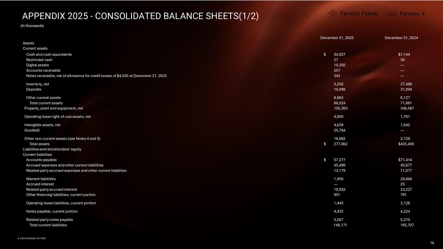 APPENDIX 2025 - CONSOLIDATED BALANCE SHEETS(1/2) (In thousands) X X X © 2024 FARADAY FUTURE © 2024 FARADAY FUTURE 16 December 31, 2024 December 31, 2025 Assets Current assets $7,144 $ 34,927 Cash and cash equivalents 30 27 Restricted cash — 10,250 Digital assets — 257 Accounts receivable — 343 Notes receivable, net of allowance for credit losses of $4,555 at December 31, 2025 27,486 3,258 Inventory, net 31,094 10,499 Deposits 6,127 8,963 Other current assets 71,881 68,524 Total current assets 348,587 155,303 Property, plant and equipment, net 1,761 4,950 Operating lease right - of - use assets, net 1,042 4,639 Intangible assets, net — 25,764 Goodwill 2,129 18,682 Other non - current assets (see Notes 4 and 5) $425,400 $ 277,862 Total assets Liabilities and stockholders’ equity Current liabilities $71,414 $ 57,277 Accounts payable 45,677 45,499 Accrued expenses and other current liabilities 11,077 13,179 Related party accrued expenses and other current liabilities 28,864 1,950 Warrant liabilities 25 — Accrued interest 23,227 19,933 Related party accrued interest 761 951 Other financing liabilities, current portion 2,128 1,443 Operating lease liabilities, current portion 4,224 4,432 Notes payable, current portion 5,310 3,507 Related party notes payable 192,707 148,171 Total current liabilities