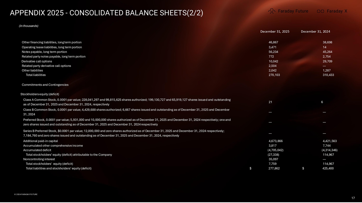 APPENDIX 2025 - CONSOLIDATED BALANCE SHEETS(2/2) (In thousands) X X X © 2024 FARADAY FUTURE © 2024 FARADAY FUTURE 17 December 31, 2024 December 31, 2025 38,698 46,867 Other financing liabilities, long term portion 14 3,471 Operating lease liabilities, long term portion 45,264 56,234 Notes payable, long term portion 2,754 772 Related party notes payable, long term portion 29,709 10,042 Derivative call options — 2,504 Related party derivative call options 1,287 2,042 Other liabilities 310,433 270,103 Total liabilities Commitments and Contingencies Stockholders equity (deficit) 6 21 Class A Common Stock, 0.0001 par value; 228,041,297 and 99,815,625 shares authorized; 199,130,727 and 65,919,127 shares issued and outstanding as of December 31, 2025 and December 31, 2024, respectively — — Class B Common Stock, 0.0001 par value; 4,429,688 shares authorized; 6,667 shares issued and outstanding as of December 31, 2025 and December 31, 2024 — — Preferred Stock, 0.0001 par value; 5,931,000 and 10,000,000 shares authorized as of December 31, 2025 and December 31, 2024 respectively; one and zero shares issued and outstanding as of December 31, 2025 and December 31, 2024 respectively — — Series B Preferred Stock, $0.0001 par value; 12,000,000 and zero shares authorized as of December 31, 2025 and December 31, 2024 respectively; 7,184,760 and zero shares issued and outstanding as of December 31, 2025 and December 31, 2024, respectively 4,421,563 4,673,866 Additional paid - in capital 7,744 3,817 Accumulated other comprehensive income (4,314,346) (4,705,042) Accumulated deficit 114,967 (27,338) Total stockholders’ equity (deficit) attributable to the Company — 35,097 Noncontrolling interest 114,967 7,759 Total stockholders' equity (deficit) $ 425,400 $ 277,862 Total liabilities and stockholders’ equity (deficit)