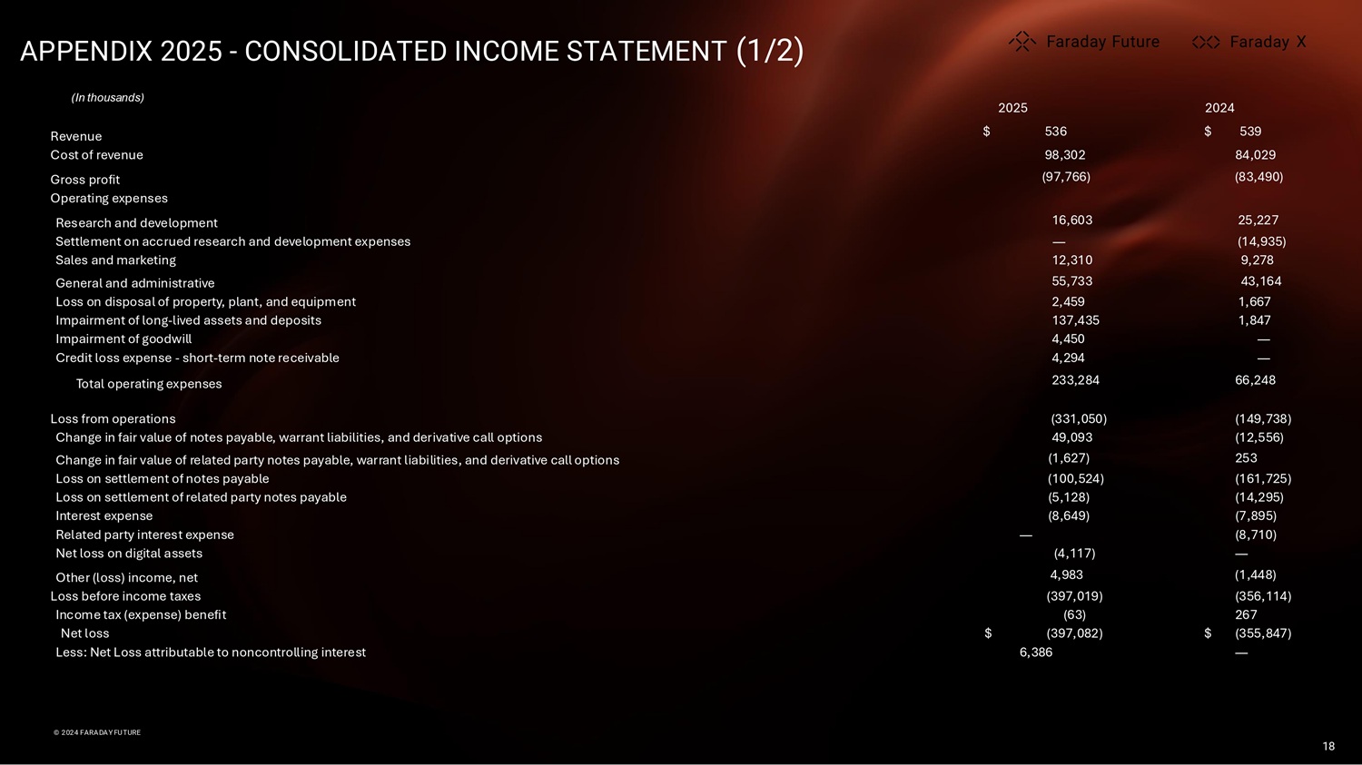 APPENDIX 2025 - CONSOLIDATED INCOME STATEMENT (1/2) (In thousands) X X X © 2024 FARADAY FUTURE © 2024 FARADAY FUTURE 18 2024 2025 $ 539 $ 536 Revenue 84,029 98,302 Cost of revenue (83,490) (97,766) Gross profit Operating expenses 25,227 16,603 Research and development (14,935) — Settlement on accrued research and development expenses 9,278 12,310 Sales and marketing 43,164 55,733 General and administrative 1,667 2,459 Loss on disposal of property, plant, and equipment 1,847 137,435 Impairment of long - lived assets and deposits — 4,450 Impairment of goodwill — 4,294 Credit loss expense - short - term note receivable 66,248 233,284 Total operating expenses (149,738) (331,050) Loss from operations (12,556) 49,093 Change in fair value of notes payable, warrant liabilities, and derivative call options 253 (1,627) Change in fair value of related party notes payable, warrant liabilities, and derivative call options (161,725) (100,524) Loss on settlement of notes payable (14,295) (5,128) Loss on settlement of related party notes payable (7,895) (8,649) Interest expense (8,710) — Related party interest expense — (4,117) Net loss on digital assets (1,448) 4,983 Other (loss) income, net (356,114) (397,019) Loss before income taxes 267 (63) Income tax (expense) benefit $ (355,847) $ (397,082) Net loss — 6,386 Less: Net Loss attributable to noncontrolling interest