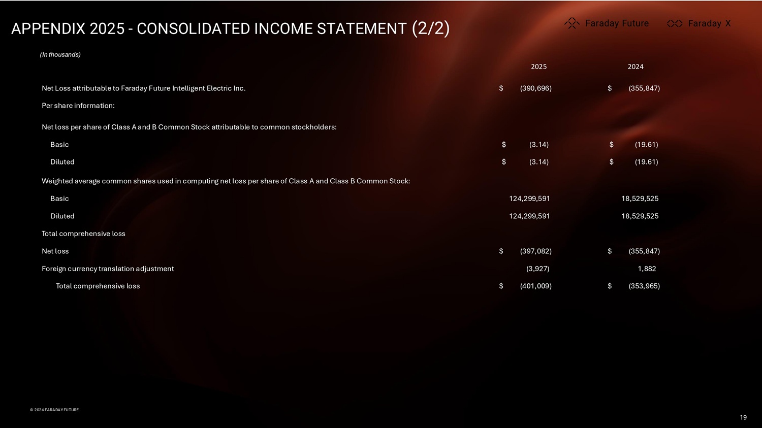 APPENDIX 2025 - CONSOLIDATED INCOME STATEMENT (2/2) (In thousands) X X X © 2024 FARADAY FUTURE © 2024 FARADAY FUTURE 19 $ (355,847) $ (390,696) Net Loss attributable to Faraday Future Intelligent Electric Inc. Per share information: Net loss per share of Class A and B Common Stock attributable to common stockholders: $ (19.61) $ (3.14) Basic $ (19.61) $ (3.14) Diluted Weighted average common shares used in computing net loss per share of Class A and Class B Common Stock: 18,529,525 124,299,591 Basic 18,529,525 124,299,591 Diluted Total comprehensive loss $ (355,847) $ (397,082) Net loss 1,882 (3,927) Foreign currency translation adjustment $ (353,965) $ (401,009) Total comprehensive loss 2024 2025