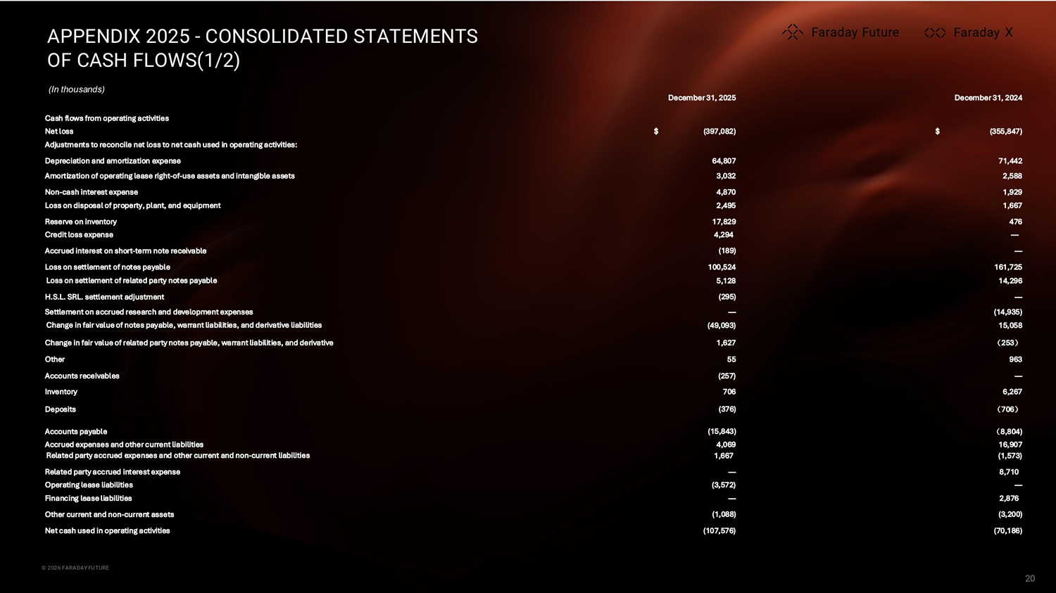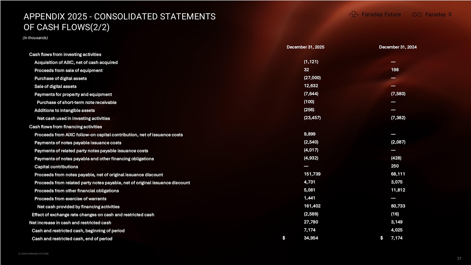 APPENDIX 2025 - CONSOLIDATED STATEMENTS OF CASH FLOWS(1/2) (In thousands) X X © 2024 FARADAY FUTURE © 2026 FARADAY FUTURE 20 X