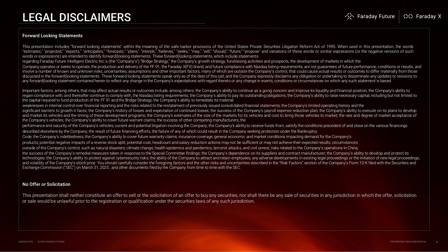 LEGAL DISCLAIMERS Forward Looking Statements This presentation includes “forward looking statements” within the meaning of the safe harbor provisions of the United States Private Securities Litigation Reform Act of 1995 . When used in this presentation, the words “estimates,” “projected,” “expects,” “anticipates,” “forecasts,” “plans,” “intends,” “believes,” “seeks,” “may,” “will,” “should,” “future,” “propose” and variations of these words or similar expressions (or the negative versions of such words or expressions) are intended to identify forward(looking statements . These forward(looking statements, which include statements regarding Faraday Future Intelligent Electric Inc . ’s (the “Company’s”) “Bridge Strategy,” the Company’s growth strategy, fundraising activities and prospects, the development of markets in which the Company operates or seeks to operate, the production and delivery of the FF 91, the Faraday X(FX) brand, and future compliance with Nasdaq listing requirements, are not guarantees of future performance, conditions or results, and involve a number of known and unknown risks, uncertainties, assumptions and other important factors, many of which are outside the Company’s control, that could cause actual results or outcomes to differ materially from those discussed in the forward(looking statements. These forward - looking statements speak only as of the date of this call, and the Company expressly disclaims any obligation or undertaking to disseminate any updates or revisions to any forward(looking statement contained herein to reflect any change in the Company’s expectations with regard thereto or any change in events, conditions or circumstances on which any such statement is based. Important factors, among others, that may affect actual results or outcomes include, among others: the Company’s ability to continue as a going concern and improve its liquidity and financial position; the Company’s ability to regain compliance with, and thereafter continue to comply with, the Nasdaq listing requirements; the Company’s ability to pay its outstanding obligations; the Company’s ability to raise necessary capital, including but not limited to the capital required to fund production of the FF 91 and the Bridge Strategy; the Company’s ability to remediate its material weaknesses in internal control over financial reporting and the risks related to the restatement of previously issued consolidated financial statements; the Company’s limited operating history and the significant barriers to growth it faces ; the Company’s history of losses and expectation of continued losses ; the success of the Company’s payroll expense reduction plan ; the Company’s ability to execute on its plans to develop and market its vehicles and the timing of these development programs ; the Company’s estimates of the size of the markets for its vehicles and cost to bring those vehicles to market ; the rate and degree of market acceptance of the Company’s vehicles ; the Company’s ability to cover future warrant claims ; the success of other competing manufacturers ; the performance and security of the Company’s vehicles; current and potential litigation involving the Company; the Company’s ability to receive funds from, satisfy the conditions precedent of and close on the various financings described elsewhere by the Company; the result of future financing efforts, the failure of any of which could result in the Company seeking protection under the Bankruptcy Code; the Company’s indebtedness; the Company’s ability to cover future warranty claims; insurance coverage; general economic and market conditions impacting demand for the Company’s products; potential negative impacts of a reverse stock split; potential cost, headcount and salary reduction actions may not be sufficient or may not achieve their expected results; circumstances outside of the Company’s control, such as natural disasters, climate change, health epidemics and pandemics, terrorist attacks, and civil unrest; risks related to the Company’s operations in China; the success of the Company’s remedial measures taken in response to the Special Committee findings; the Company’s dependence on its suppliers and contract manufacturer; the Company’s ability to develop and protect its technologies; the Company’s ability to protect against cybersecurity risks; the ability of the Company to attract and retain employees; any adverse developments in existing legal proceedings or the initiation of new legal proceedings; and volatility of the Company’s stock price. You should carefully consider the foregoing factors and the other risks and uncertainties described in the “Risk Factors” section of the Company’s Form 10 - K filed with the Securities and Exchange Commission (“SEC”) on March 31, 2025 , and other documents filed by the Company from time to time with the SEC. No Offer or Solicitation This presentation shall neither constitute an offer to sell or the solicitation of an offer to buy any securities, nor shall there be any sale of securities in any jurisdiction in which the offer, solicitation or sale would be unlawful prior to the registration or qualification under the securities laws of any such jurisdiction . NASDAQ: FFAI © 2026 FARADAY FUTURE PROPRIETARY AND CONFIDENTIAL 2