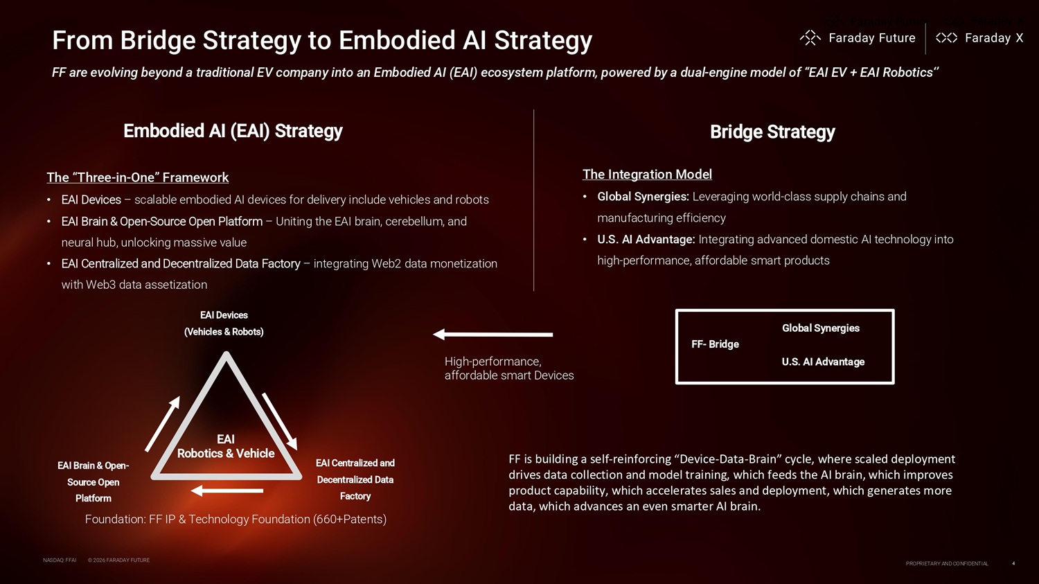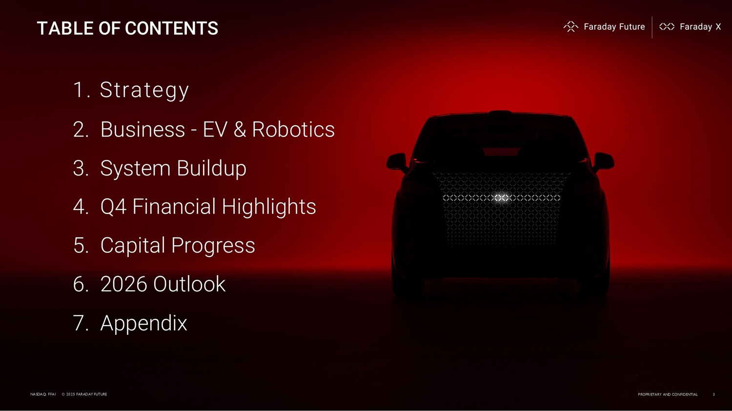 TABLE OF CONTENTS 1. Strategy 2. Business - EV & Robotics 3. System Buildup 4. Q4 Financial Highlights 5. Capital Progress 6. 2026 Outlook 7. Appendix NASDAQ: FFAI © 2026 FARADAY FUTURE PROPRIETARY AND CONFIDENTIAL 3