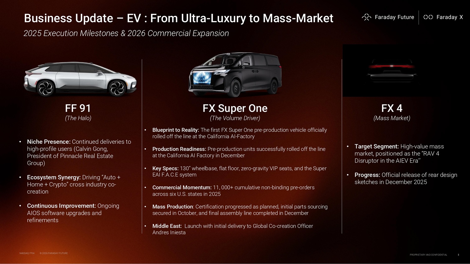 Business Update – EV : From Ultra - Luxury to Mass - Market FF 91 (The Halo) 2025 Execution ilestones & 2026 Commercial Expansion FX 4 ( ass arket) • Niche Presence: Continued deliveries to high - profile users (Calvin Gong, President of Pinnacle Real Estate Group) • Ecosystem Synergy: Driving “Auto + Home + Crypto” cross industry co - creation • Continuous Improvement: Ongoing AIOS software upgrades and refinements FX Super One (The Volume Driver) • Blueprint to Reality: The first FX Super One pre - production vehicle officially rolled off the line at the California AI - Factory NASDAQ: FFAI © 2026 FARADAY FUTURE PROPRIETARY AND CONFIDENTIAL 5 • Production Readiness: Pre - production units successfully rolled off the line at the California AI Factory in December • Key Specs: 130” wheelbase, flat floor, zero - gravity VIP seats, and the Super EAI F.A.C.E system • Commercial Momentum: 11, 000+ cumulative non - binding pre - orders across six U.S. states in 2025 • Mass Production: Certification progressed as planned, initial parts sourcing secured in October, and final assembly line completed in December • Middle East: Launch with initial delivery to Global Co - creation Officer Andres Iniesta • Target Segment: High - value mass market, positioned as the “RAV 4 Disruptor in the AIEV Era‘’ • Progress: Official release of rear design sketches in December 2025
