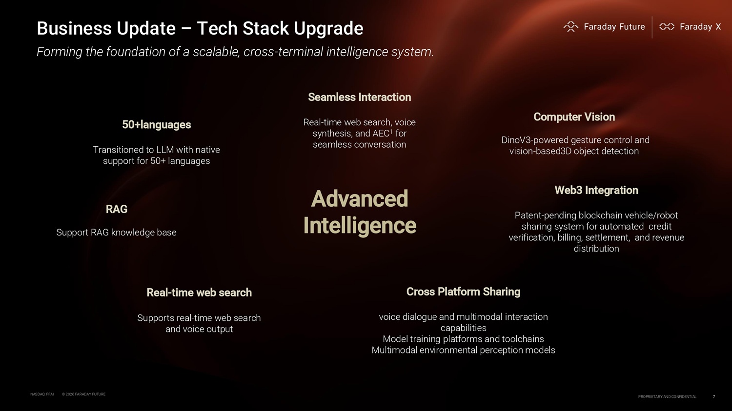 Business Update – Tech Stack Upgrade Cross Platform Sharing voice dialogue and multimodal interaction capabilities Model training platforms and toolchains Multimodal environmental perception models Forming the foundation of a scalable, cross - terminal intelligence system. Seamless Interaction Real - time web search, voice synthesis, and AEC 1 for seamless conversation 50+languages Transitioned to LLM with native support for 50+ languages Web3 Integration Patent - pending blockchain vehicle/robot sharing system for automated credit verification, billing, settlement, and revenue distribution Computer Vision DinoV3 - powered gesture control and vision - based3D object detection Real - time web search Supports real - time web search and voice output RA G Support RAG knowledge base Advanced Intelligence NASDAQ: FFAI © 2026 FARADAY FUTURE PROPRIETARY AND CONFIDENTIAL 7