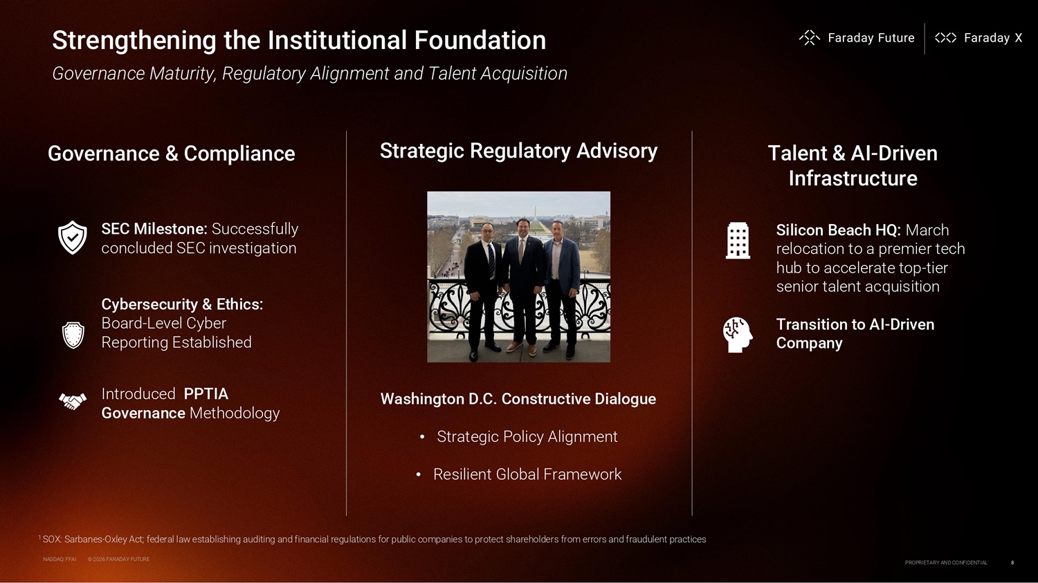 Strengthening the Institutional Foundation Governance & Compliance Governance aturity, Regulatory Alignment and Talent Acquisition SEC Milestone: Successfully concluded SEC investigation NASDAQ: FFAI © 2026 FARADAY FUTURE PROPRIETARY AND CONFIDENTIAL 8 Cybersecurity & Ethics: Board - Level Cyber Reporting Established Introduced PPTIA Governance Methodology 1 SOX: Sarbanes - Oxley Act; federal law establishing auditing and financial regulations for public companies to protect shareholders from errors and fraudulent practices Washington D.C. Constructive Dialogue • Strategic Policy Alignment • Resilient Global Framework Strategic Regulatory Advisory Talent & AI - Driven Infrastructure Silicon Beach HQ: March relocation to a premier tech hub to accelerate top - tier senior talent acquisition Transition to AI - Driven Company