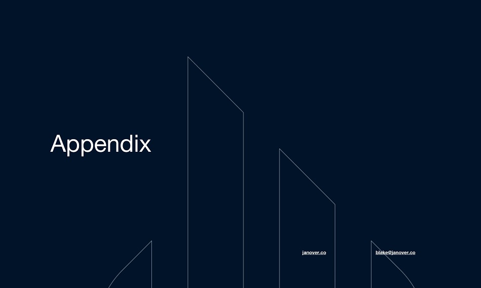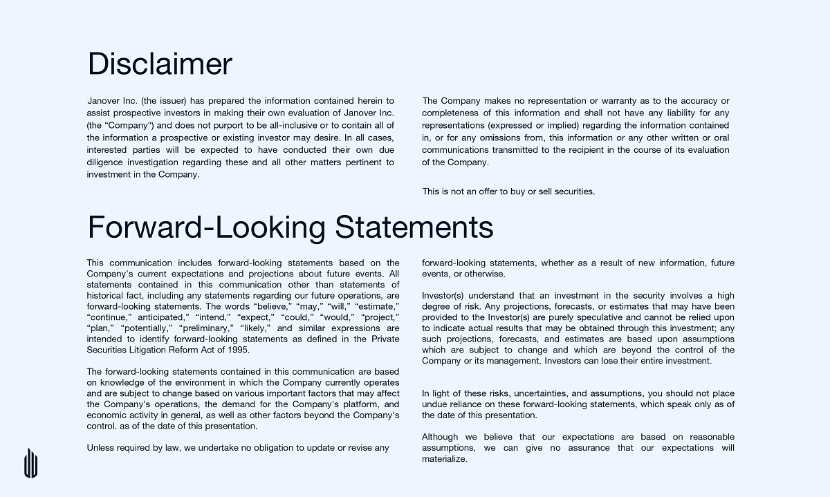 Disclaimer Forward - Looking Statements This communication includes forward - looking statements based on the Company's current expectations and projections about future events . All statements contained in this communication other than statements of historical fact, including any statements regarding our future operations, are forward - looking statements . The words “believe,” “may,” “will,” “estimate,” “continue,” anticipated,” “intend,” “expect,” “could,” “would,” “project,” “plan,” “potentially,” “preliminary,” “likely,” and similar expressions are intended to identify forward - looking statements as defined in the Private Securities Litigation Reform Act of 1995 . The forward - looking statements contained in this communication are based on knowledge of the environment in which the Company currently operates and are subject to change based on various important factors that may affect the Company's operations, the demand for the Company's platform, and economic activity in general, as well as other factors beyond the Company's control . as of the date of this presentation . Unless required by law, we undertake no obligation to update or revise any forward - looking statements, whether as a result of new information, future events, or otherwise. Investor(s) understand that an investment in the security involves a high degree of risk . Any projections, forecasts, or estimates that may have been provided to the Investor(s) are purely speculative and cannot be relied upon to indicate actual results that may be obtained through this investment ; any such projections, forecasts, and estimates are based upon assumptions which are subject to change and which are beyond the control of the Company or its management . Investors can lose their entire investment . In light of these risks, uncertainties, and assumptions, you should not place undue reliance on these forward - looking statements, which speak only as of the date of this presentation . Although we believe that our expectations are based on reasonable assumptions, we can give no assurance that our expectations will materialize . Janover Inc . (the issuer) has prepared the information contained herein to assist prospective investors in making their own evaluation of Janover Inc . (the “Company“) and does not purport to be all - inclusive or to contain all of the information a prospective or existing investor may desire . In all cases, interested parties will be expected to have conducted their own due diligence investigation regarding these and all other matters pertinent to investment in the Company . The Company makes no representation or warranty as to the accuracy or completeness of this information and shall not have any liability for any representations (expressed or implied) regarding the information contained in, or for any omissions from, this information or any other written or oral communications transmitted to the recipient in the course of its evaluation of the Company . This is not an offer to buy or sell securities.