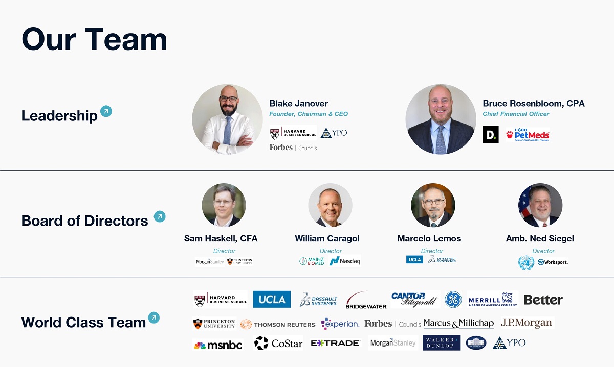 Our Team Blake Janover F o un d e r , C h airma n & CEO Bruce Rosenbloom, CPA C hi e f F i n a n c ia l Off i c e r Wi l li a m C a r ag o l Director Sam Haskell, CFA Director Marcelo Lemos Director Amb. Ned Siegel Director Leadership Board of Directors World Class Team