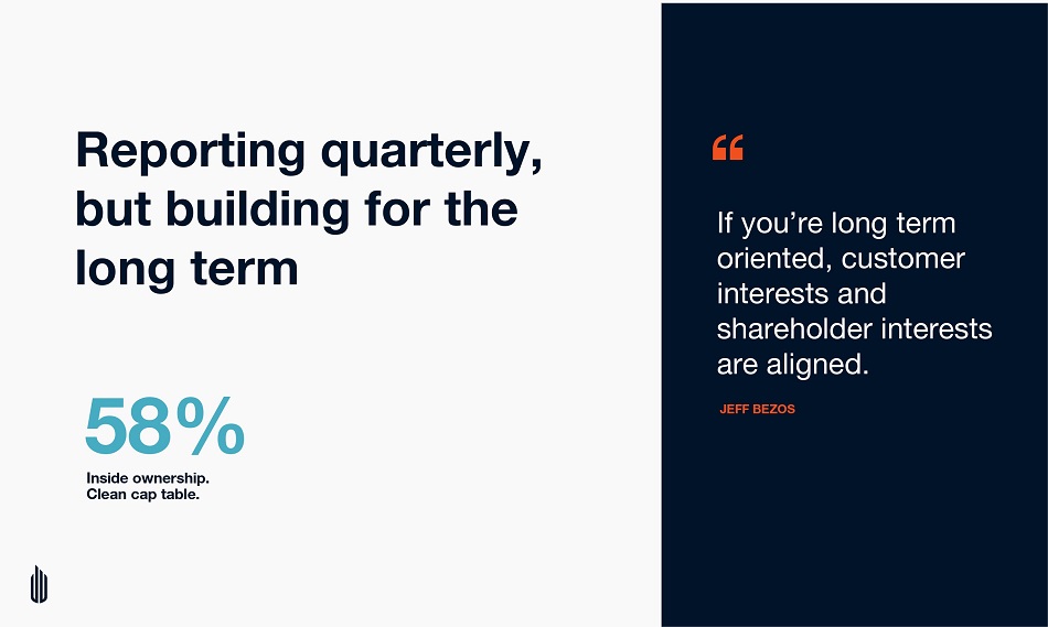 If yo u ’re lon g term oriented, customer interests and shareholder interests are aligned. JEFF BEZOS Reporting quarterly, but building for the long term I n s i de ow n e r s h i p. Clean cap table. 58%