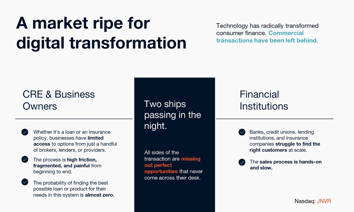 Technology has radically transformed consumer finance. Commercial t r a n s action s h av e been l e f t beh i n d. A market ripe for digital transformation All sides of the transaction are missing out perfect opportunities that never come across their desk. Two ships passing in the night. CR E & B u si n ess Owners Whether it’s a loan or an insurance policy, businesses have limited access to options from just a handful of brokers, lenders, or providers. The process is high friction, fragmented, and painful from beginning to end. The probability of finding the best possible loan or product for their needs in this system is almost zero. The sales process is hands - on and slow. Financial Ins t i t u t ion s Banks, credit unions, lending i n s t i t u t i o n s , a n d i n s u r a n c e companies struggle to find the right customers at scale. Nasdaq: JNVR