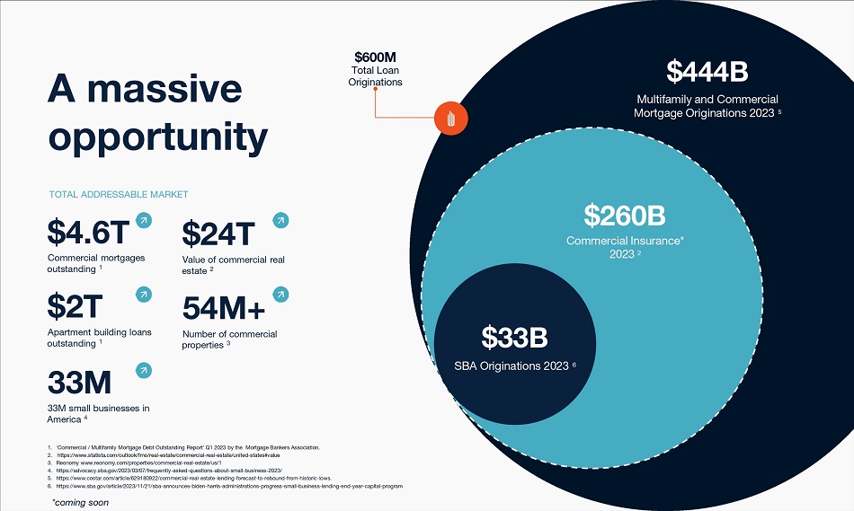 $4.6T Commercial mortgages outstanding 1 A massive op p ortun i ty $444B Multifamily and Commercial Mortgage Originations 2023 5 $2T Apartment building loans outstanding 1 $24T Value of commercial real estate 2 54M+ Number of commercial properties 3 TOTAL ADDRESSABLE MARKET $260B C o mm e r cia l I n s u r a n c e * 2023 2 $33B SBA Originations 2023 6 33M 33M small businesses in America 4 1. 'Commercial / Multifamily Mortgage Debt Outstanding Report’ Q1 2023 by the Mortgage Bankers Association. 2. https: //www. st atista.com/outlook/fmo/real - estate/commercial - real - estate/united - states#value 3. Reonomy www.reonomy.com/properties/commercial - real - estate/us/1 4. https://advocacy.sba.gov/2023/03/07/frequently - asked - questions - about - small - business - 2023/ https://www.costar.com/article/629180922/commercial - real - estate - lending - forecast - to - rebound - from - historic - lows . 5. 6. https: //www. sb a.gov/article/2023/11/21/sba - announces - biden - harris - administrations - progress - small - business - lending - end - year - capital - program $600M T o t a l Lo an Originat ions * c o m in g s oo n