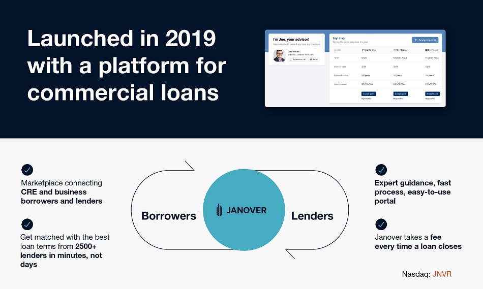 Launched in 2019 w i t h a platform for commercial loans Marketplace connecting CRE and business borrowers and lenders Get matched with the best loan terms from 2500+ l e nd e r s in m i n u te s , not days Expert guidance, fast process, easy - to - use portal Janover takes a fee every time a loan closes Borrowers Lend e rs Nasdaq: JNVR