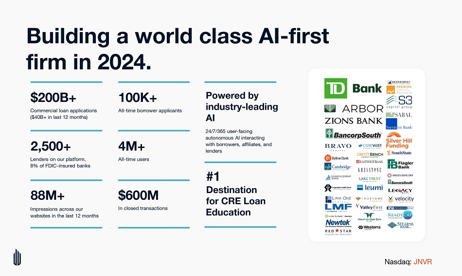Building a world class AI - first firm in 2024. $200B+ Commercial loan applications ($40B+ in last 12 months) 2,500+ Lenders on our platform, 8% of FDIC - insured banks 88M+ Impressions across our websites in the last 12 months 100K+ All - time borrower applicants 4M+ All - time users Powered by industr y - le a ding AI 24/7/365 user - facing autonomous AI interacting with borrowers, affiliates, and lenders #1 Destination for CRE Loan Education $600M In cl o sed t r a n sa c t io n s Nasdaq: JNVR