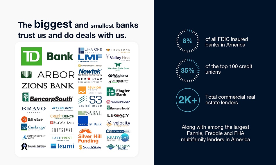 The biggest an d smalles t banks trus t us an d do dea l s with u s . 8% of all FDIC insured banks in America 35% of the top 100 credit unions 2 K + Total commercial real estate lenders Along with among the largest Fannie, Freddie and FHA multifamily lenders in America