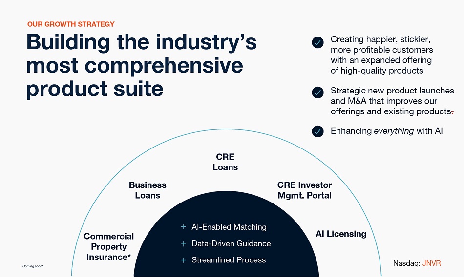 Building the industry’s most comprehensive product suite OUR GROWTH STRATEGY AI - Enabled Matching Data - Driven Guidance Streamlined Process B usin e ss Loans Com m e r c ial Property Insurance* CRE L o a ns CRE Investor M g m t . P ort a l A I L ic e n s i n g Creating happier, stickier, more profitable customers with an expanded offering of high - quality products Strategic new product launches and M&A that improves our offerings and existing products . En h a n ci n g ev e r yt h in g wi th AI C o m i n g s oo n * Nasdaq: JNVR