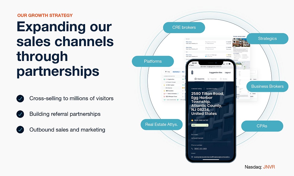 Expanding our sales channels through partnerships OUR GROWTH STRATEGY Strategics CRE brokers B u s i n e s s B rok e rs Cross - selling to millions of visitors Building referral partnerships Outbound sales and marketing CP A s P l a t f o rms Real Estate Attys. Nasdaq: JNVR
