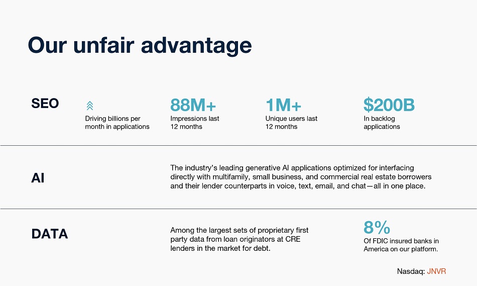 Our unfair advantage S E O 88M+ I m p r e ss i o n s l a s t 12 months 1M+ Unique users last 12 months $200B I n b a c kl og a pp li c a t i o n s AI DATA 8% Of FDIC insured banks in America on our platform. Among the largest sets of proprietary first party data from loan originators at CRE lenders in the market for debt. The industry’s leading generative AI applications optimized for interfacing directly with multifamily, small business, and commercial real estate borrowers and their lender counterparts in voice, text, email, and chat — all in one place. Driving billions per month in applications Nasdaq: JNVR