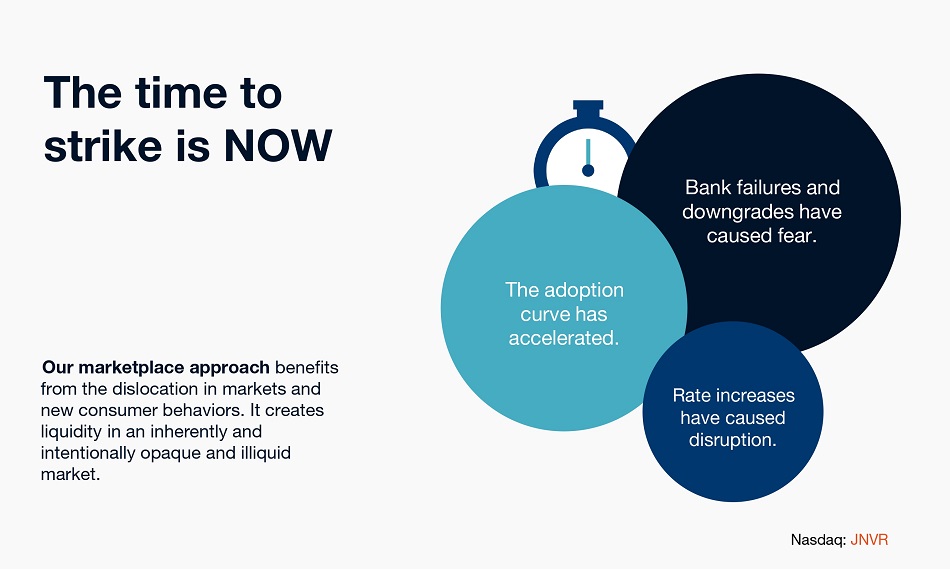 The time to strike is NOW Our marketplace approach benefits from the dislocation in markets and new consumer behaviors. It creates liquidity in an inherently and intentionally opaque and illiquid market. Rate increases have caused disruption. Bank failures and do w ng r a d e s h a v e caused fear. The adoption curve has accelerated. Nasdaq: JNVR