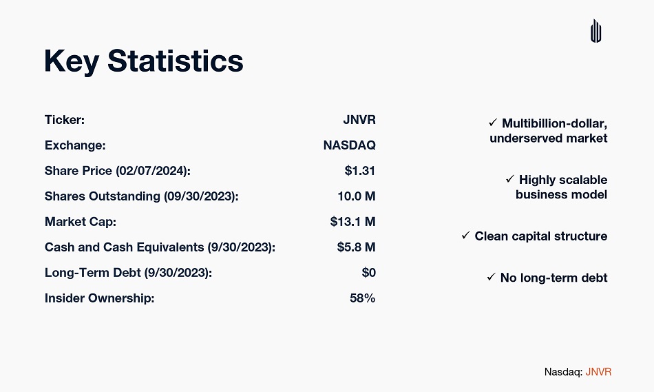 N a s daq: JN V R Key Statistics JNVR Ticker : NASDAQ Exchange: $1.31 Share Price (02/07/2024): 10.0 M Shares Outstanding (09/30/2023): $13. 1 M Market Cap: $5. 8 M Cash and Cash Equivalents (9/30/2023): $0 Long - Term Debt (9/30/2023): 58% I nsid e r O w n e r s hip: x Multibillion - dollar, underserved market x Hig h ly sc a la b le business model x Clean capital structure x No long - term debt