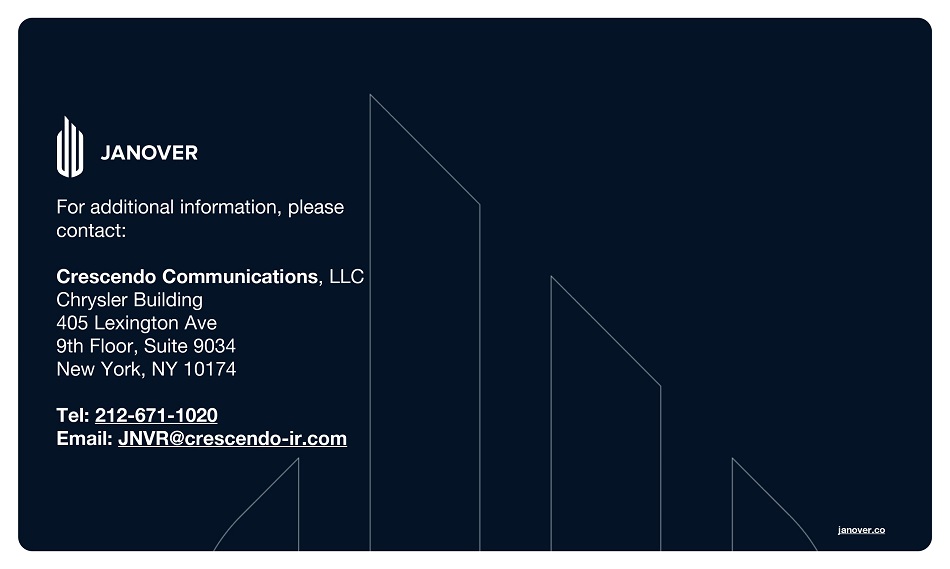 janover.co For additional information, please contact: Crescendo Communications , LLC Chrysler Building 405 Lexington Ave 9th Floor, Suite 9034 New York, NY 10174 Tel: 212 - 671 - 1020 Email: JNVR@crescendo - ir.com