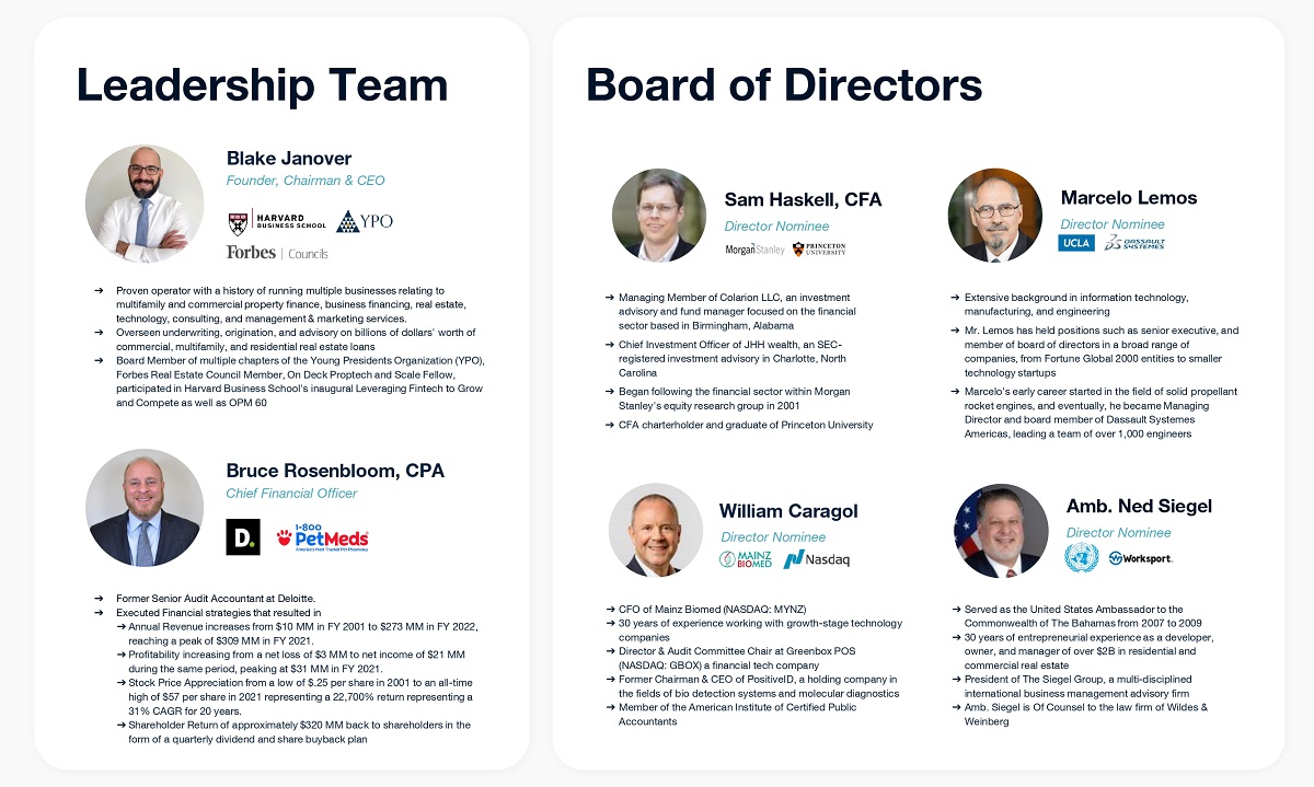 Bla k e J a n over Founder , Chairman & CEO Bruce Rosenbloom, CPA Chi e f Fin a nci a l Offic e r Leadership Team ➔ Proven operator with a history of running multiple businesses relating to multifamily and commercial property finance, business financing, real estate, technology, consulting, and management & marketing services. ➔ Overseen underwriting, origination, and advisory on billions of dollars' worth of commercial, multifamily, and residential real estate loans ➔ Board Member of multiple chapters of the Young Presidents Organization (YPO), Forbes Real Estate Council Member, On Deck Proptech and Scale Fellow, participated in Harvard Business School's inaugural Leveraging Fintech to Grow a n d C om pe t e a s w e l l a s O P M 6 0 Board of Directors ➔ F o rm e r S e ni o r A u d i t A cc o un t a n t a t D e l o i tt e . ➔ E x e c u t e d F i n a n c i a l s t r a t e g i e s t h a t r e s u l t e d i n ➔ Annual Revenue increases from $10 MM in FY 2001 to $273 MM in FY 2022, r e a c h i n g a p e ak o f $30 9 M M i n F Y 2021 . ➔ Profitability increasing from a net loss of $3 MM to net income of $21 MM during the same period, peaking at $31 MM in FY 2021. ➔ Stock Price Appreciation from a low of $.25 per share in 2001 to an all - time high of $57 per share in 2021 representing a 22,700% return representing a 31% CAGR for 20 years. ➔ Shareholder Return of approximately $320 MM back to shareholders in the f or m o f a q u a r t e r l y d i v i d e n d a n d s h a re b u yb a c k p l a n Wi l li a m C a r ag o l Directo r Nominee Sam Haskell, CFA Dire cto r No m inee Marcelo Lemos Directo r Nominee Amb. Ned Siegel Directo r Nominee ➔ M a n a g in g M e m b e r o f C o l a r i o n LL C , a n i n v es t m e n t a dv i sory a n d f un d m a n a g e r f oc u s e d o n t h e f i n a n c i a l sector based in Birmingham, Alabama ➔ C h i e f I n v es t m e n t O f f i c e r o f J H H w ea l t h , a n S E C - r e g i s t e r e d i n v es t m e n t a dv i sory i n C h a r l o t t e , N or t h Carolina ➔ Began following the financial sector within Morgan S t a n l e y ' s e q u i t y r e s e a r c h gr o u p i n 200 1 ➔ CFA charterholder and graduate of Princeton University ➔ Extensive background in information technology, ma nu f a c t u r i n g , a n d e n g i n ee r i n g ➔ Mr. Lemos has held positions such as senior executive, and mem b e r o f b o a rd o f d i r e c t or s i n a b ro a d r a n g e of c o m p a n i e s, f rom For t un e G l o b a l 200 0 e n t i t i e s t o s m a ll e r technology startups ➔ Marcelo's early career started in the field of solid propellant rocket engines, and eventually, he became Managing D i r e c t or a n d b o a rd mem b e r o f D a ss a u l t Sys t eme s Americas, leading a team of over 1,000 engineers ➔ C F O o f M a i n z B i om e d ( N A S D A Q: M Y N Z ) ➔ 30 years of experience working with growth - stage technology companies ➔ Director & Audit Committee Chair at Greenbox POS (NASDAQ: GBOX) a financial tech company ➔ F o rm e r C h a i rm a n & C EO o f P o s i t i v e I D , a h o l d i n g c ompa n y i n the fields of bio detection systems and molecular diagnostics ➔ M e m b e r o f t h e A m e r i c a n I n s t i t u t e o f C e r t i f i e d P u b l i c Accountants ➔ Served as the United States Ambassador to the C o m m o n wea l t h o f T h e B a h ama s f rom 200 7 t o 200 9 ➔ 30 years of entrepreneurial experience as a developer, owner, and manager of over $2B in residential and c o m me r c i a l r e a l e s t a t e ➔ P r e s i d e n t of T h e S i e g e l G ro u p , a m u l t i - d i s c i p l in e d international business management advisory firm ➔ Amb. Siegel is Of Counsel to the law firm of Wildes & Weinberg
