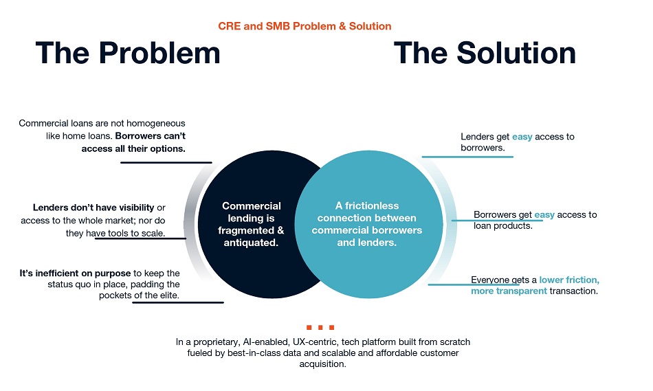 CR E a nd SMB P rob le m & So l uti on The Problem I t ’s i n eff i c i e n t on p u rpos e t o ke e p t h e status quo in place, padding the pockets of the elite. Commercial loans are not homogeneous like home loans. Borrowers can’t access all their options. Lenders don’t have visibility or access to the whole market; nor do they have tools to scale. The Solution Borrowers get ea sy access to loan products. In a proprietary, AI - enabled, UX - centric, tech platform built from scratch fueled by best - in - class data and scalable and affordable customer acquisition. Lenders get easy access to borrowers. Everyone ge ts a lower friction, more transparent transaction. Commercial lending is fragmented & antiquated. A frictionless connection between commercial borrowers and lenders.