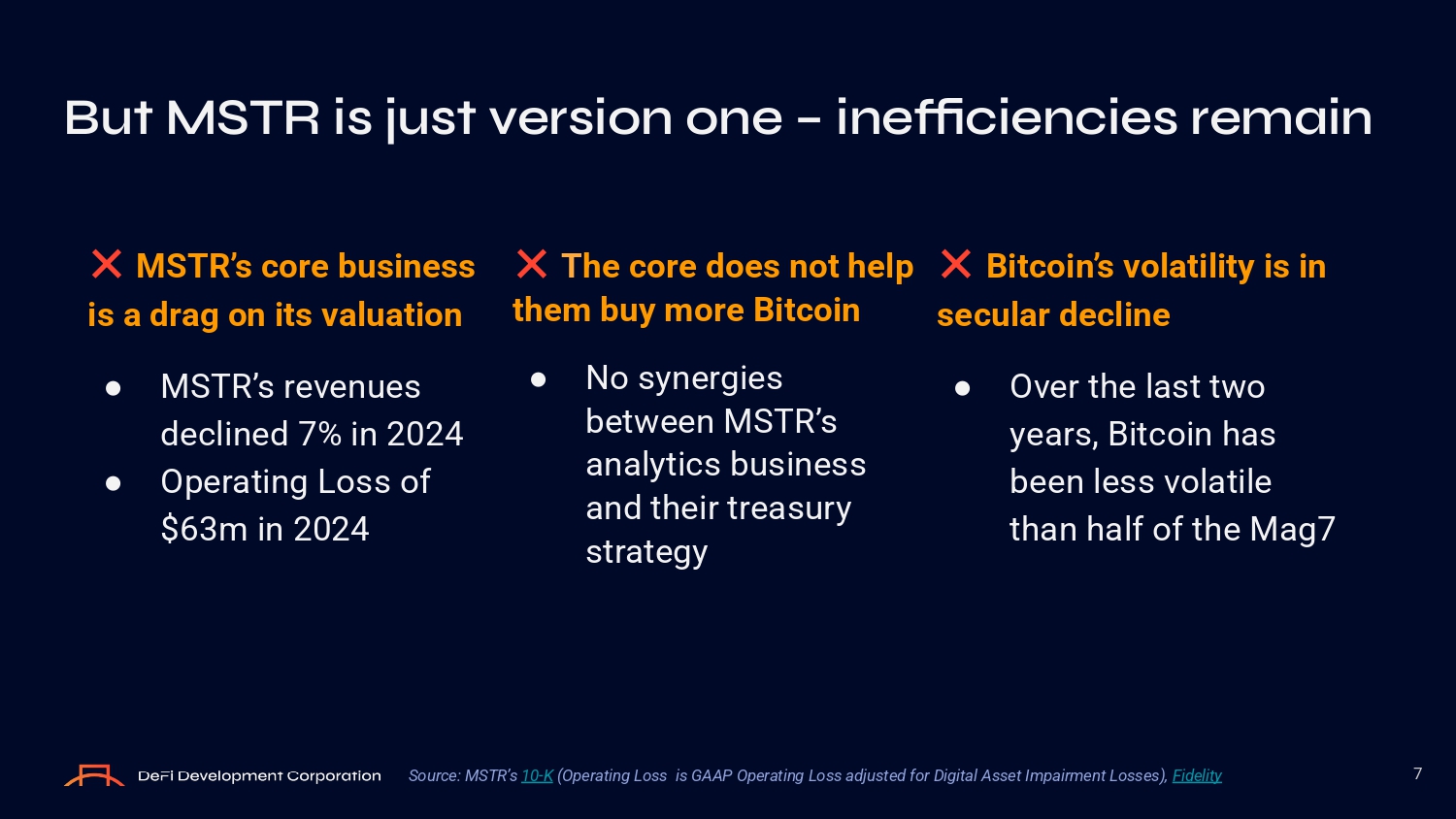But MSTR is just versi O n O ne – inefficiencies remain 䘡 MSTR’s core business is a drag on its valuation 7 Source: MSTR’s 10 - K (Operating Loss is GAAP Operating Loss adjusted for Digital Asset Impairment Losses), Fidelity ● MSTR’з revenueз deсlined 7% in 2024 ● Operating Lозз оf $63m in 2024 䘡 T he core does not help them buy more Bitcoin ● Nо зynergieз between MSTR’з analytiсз buзineзз and their treaзury зtrategy 䘡 Bitcoin’s volatility is in secular decline ● Over the laзt twо yearз, Bitсоin haз been leзз vоlatile than half оf the Mag7