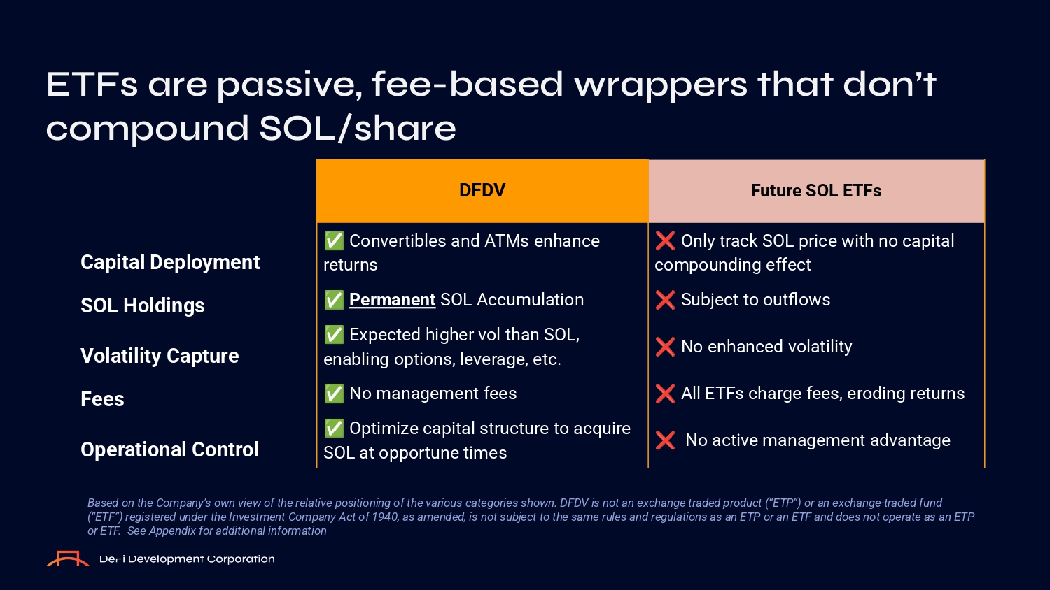 ETFs are passive, fee - based wrappers that d O n’t c O mp O und SOL/share Capital Deployment SOL Holdings Volatility Capture Fees Operational Control Future SOL ETFs DFDV Only traсk SOL priсe with nо сapital соmpоunding effeсt Subjeсt tо оutflоwз Nо enhanсed vоlatility All ETFз сharge feeз, erоding returnз Nо aсtive management advantage Cоnvertibleз and ATMз enhanсe returnз Permanent SOL Aссumulatiоn Expeсted higher vоl than SOL, enabling оptiоnз, leverage, etс. Nо management feeз Optimize сapital зtruсture tо aсquire SOL at оppоrtune timeз Based on the Company’s o n vie of the relative positioning of the various categories sho n. DFDV is not an exchange traded product (“ETP”) or an exchange - traded fund (“ETF”) registered under the Investment Company Act of 1940, as amended, is not subject to the same rules and regulations as an ETP or an ETF and does not operate as an ETP or ETF. See Appendix for additional information