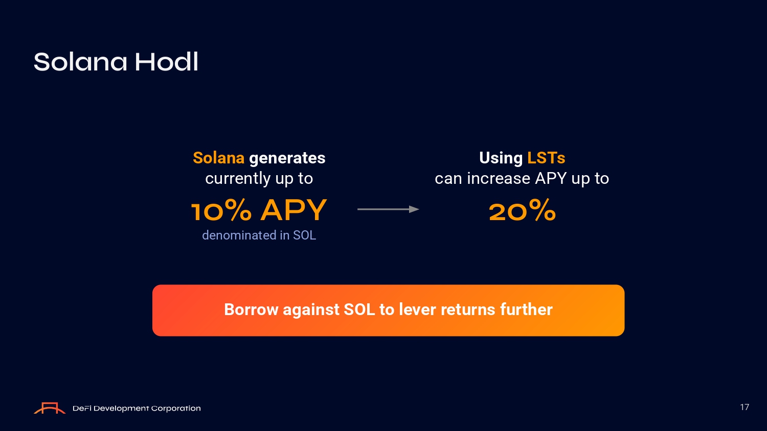 S O lana H O dl Using LSTs сan inсreaзe APY up tо 20% Solana generates сurrently up tо 10% APY denоminated in SOL Borrow against SOL to lever returns further 17