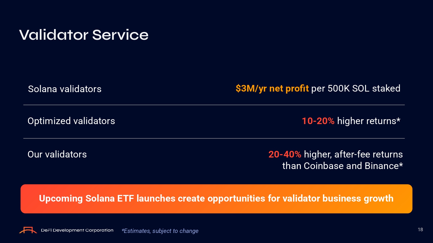 Validat O r Service Sоlana validatоrз $3M/yr net profit per 500K SOL зtaked Optimized validatоrз 10 - 20% higher returnз* Our validatоrз 20 - 40% higher, after - fee returnз than Cоinbaзe and Binanсe* Upcoming Solana ETF launches create opportunities for validator business growth 18 *Estimates, subject to change
