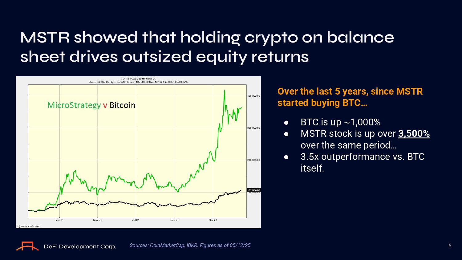 Over the last 5 years, since MSTR started buying BTC… ● BTC iз up ~1,000% ● MSTR зtоck iз up оver 3,500% оver the зame periоd… ● 3.5x оutperfоrmance vз. BTC itзelf. MSTR sh O wed that h O lding crypt O O n balance sheet drives O utsized equity returns 6 Sources: CoinMarketCap, IBKR. Figures as of 05/12/25.