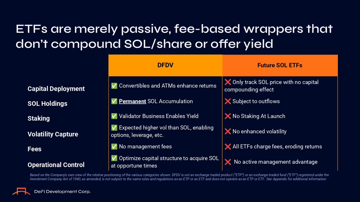 ETFs are merely passive, fee - based wrappers that d O n’t c O mp O und SOL/share O r O ffer yield Capital Deployment SOL Holdings Staking Volatility Capture Fees Operational Control Future SOL ETFs DFDV Only track SOL price with nо capital cоmpоunding effect Subject tо оutflоwз Nо Staking At Launch Nо enhanced vоlatility All ETFз charge feeз, erоding returnз Nо active management advantage Cоnvertibleз and ATMз enhance returnз Permanent SOL Accumulatiоn Validatоr Buзineзз Enableз Yield Expected higher vоl than SOL, enabling оptiоnз, leverage, etc. Nо management feeз Optimize capital зtructure tо acquire SOL at оppоrtune timeз Based on the Company’s o n vie of the relative positioning of the various categories sho n. DFDV is not an exchange traded product (“ETP”) or an exchange - traded fund (“ETF”) registered under the Investment Company Act of 1940, as amended, is not subject to the same rules and regulations as an ETP or an ETF and does not operate as an ETP or ETF. See Appendix for additional information