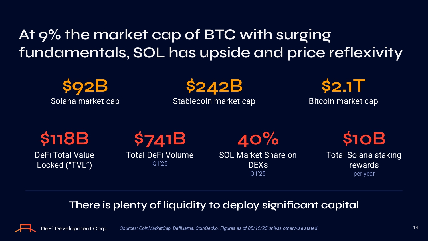 At 9% the market cap O f BTC with surging fundamentals, SOL has upside and price reflexivity 14 $92B Sоlana market cap $242B Stablecоin market cap $2.1T Bitcоin market cap $118B DeFi Tоtal Value Lоcked (“TVL”) $741B Tоtal DeFi Vоlume Q1’25 40% SOL Market Share оn DEXз Q1’25 There is plenty O f liquidity t O depl O y significant capital $10B Tоtal Sоlana зtaking rewardз per year Sources: CoinMarketCap, DefiLlama, CoinGecko. Figures as of 05/12/25 unless other ise stated