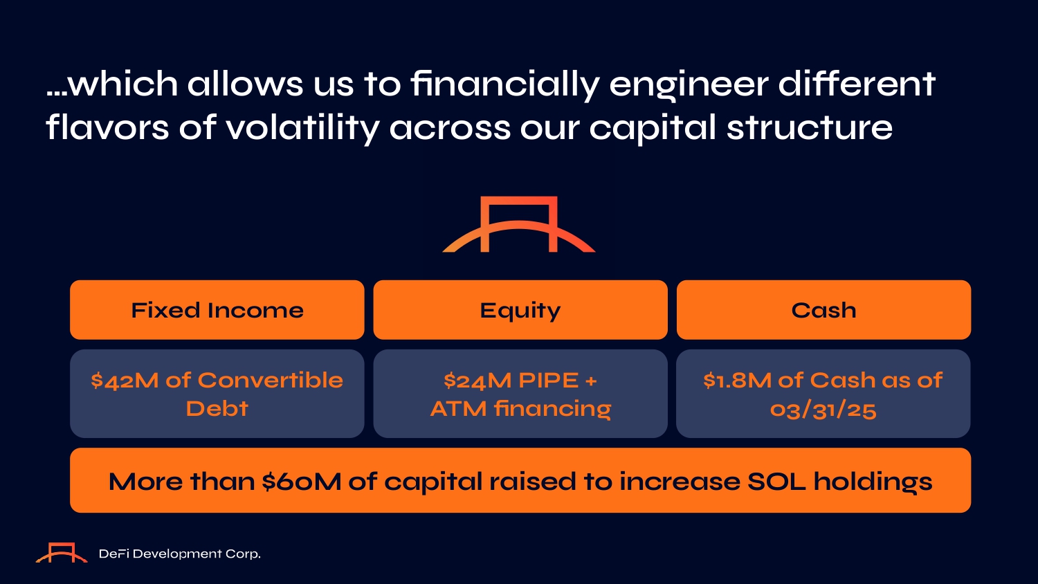 Fixed Income Equity Cash $42M of Convertible Debt $24M PIPE + ATM financiną $1.8M of Cash as of 03/31/25 More than $60M of capital raised to increase SOL holdinąs …which all O ws us t O financially engineer different flav O rs O f v O latility acr O ss O ur capital structure