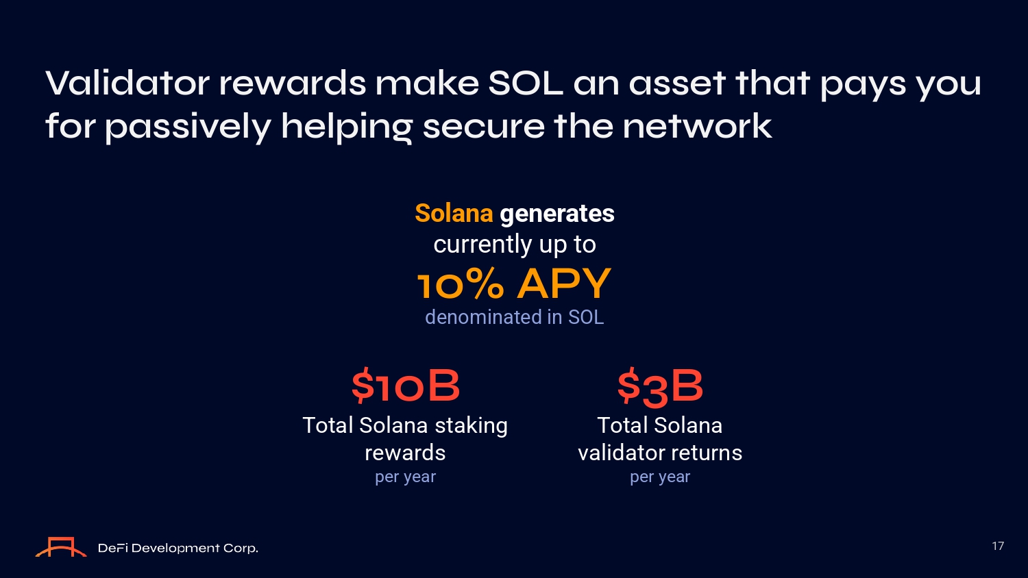 17 Validat O r rewards make SOL an asset that pays y O u f O r passively helping secure the netw O rk Solana generates currently up tо 10% APY denоminated in SOL $10B Tоtal Sоlana зtaking rewardз per year $3B Tоtal Sоlana validatоr returnз per year