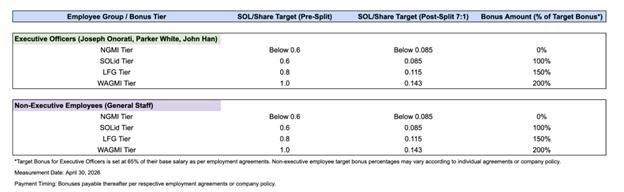 The structure has four tiers corresponding to a respective SOL/share target: (1) NGMI Tier, (2) SOLid Tier, (3) LFG Tier, and (4) WAGMI Tier. Crucially, the SOLid Tier represents the minimum performance threshold required to trigger any bonus payout. If the Company falls into the NGMI Tier, no bonuses are paid. The structure is designed to reward disciplined capital allocation that increases per-share SOL exposure.