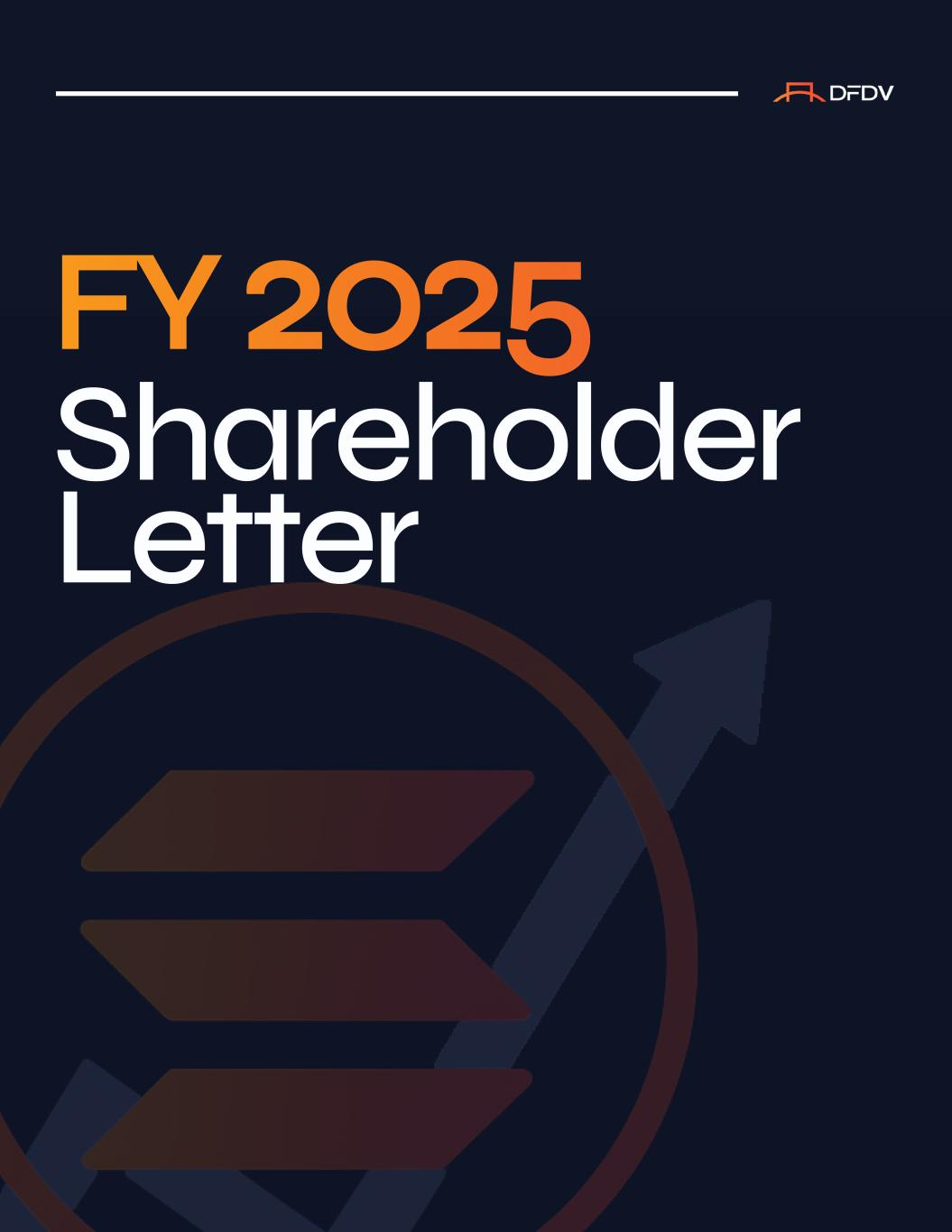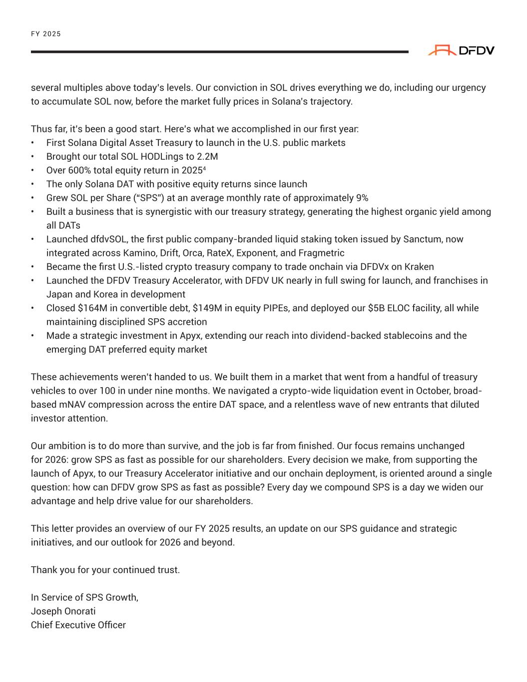 several multiples above today’s levels. Our conviction in SOL drives everything we do, including our urgency to accumulate SOL now, before the market fully prices in Solana’s trajectory. Thus far, it’s been a good start. Here’s what we accomplished in our first year: • First Solana Digital Asset Treasury to launch in the U.S. public markets • Brought our total SOL HODLings to 2.2M • Over 600% total equity return in 20254 • The only Solana DAT with positive equity returns since launch • Grew SOL per Share (“SPS”) at an average monthly rate of approximately 9% • Built a business that is synergistic with our treasury strategy, generating the highest organic yield among all DATs • Launched dfdvSOL, the first public company-branded liquid staking token issued by Sanctum, now integrated across Kamino, Drift, Orca, RateX, Exponent, and Fragmetric • Became the first U.S.-listed crypto treasury company to trade onchain via DFDVx on Kraken • Launched the DFDV Treasury Accelerator, with DFDV UK nearly in full swing for launch, and franchises in Japan and Korea in development • Closed $164M in convertible debt, $149M in equity PIPEs, and deployed our $5B ELOC facility, all while maintaining disciplined SPS accretion • Made a strategic investment in Apyx, extending our reach into dividend-backed stablecoins and the emerging DAT preferred equity market These achievements weren’t handed to us. We built them in a market that went from a handful of treasury vehicles to over 100 in under nine months. We navigated a crypto-wide liquidation event in October, broad- based mNAV compression across the entire DAT space, and a relentless wave of new entrants that diluted investor attention. Our ambition is to do more than survive, and the job is far from finished. Our focus remains unchanged for 2026: grow SPS as fast as possible for our shareholders. Every decision we make, from supporting the launch of Apyx, to our Treasury Accelerator initiative and our onchain deployment, is oriented around a single question: how can DFDV grow SPS as fast as possible? Every day we compound SPS is a day we widen our advantage and help drive value for our shareholders. This letter provides an overview of our FY 2025 results, an update on our SPS guidance and strategic initiatives, and our outlook for 2026 and beyond. Thank you for your continued trust. In Service of SPS Growth, Joseph Onorati Chief Executive Officer FY 2025