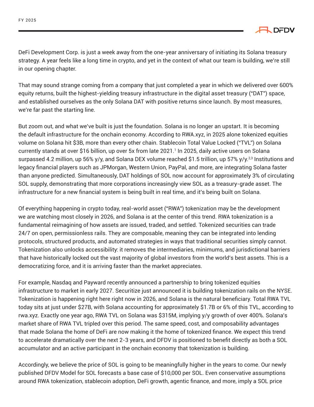 DeFi Development Corp. is just a week away from the one-year anniversary of initiating its Solana treasury strategy. A year feels like a long time in crypto, and yet in the context of what our team is building, we’re still in our opening chapter. That may sound strange coming from a company that just completed a year in which we delivered over 600% equity returns, built the highest-yielding treasury infrastructure in the digital asset treasury (“DAT”) space, and established ourselves as the only Solana DAT with positive returns since launch. By most measures, we’re far past the starting line. But zoom out, and what we’ve built is just the foundation. Solana is no longer an upstart. It is becoming the default infrastructure for the onchain economy. According to RWA.xyz, in 2025 alone tokenized equities volume on Solana hit $3B, more than every other chain. Stablecoin Total Value Locked (“TVL”) on Solana currently stands at over $16 billion, up over 5x from late 2021.1 In 2025, daily active users on Solana surpassed 4.2 million, up 56% y/y, and Solana DEX volume reached $1.5 trillion, up 57% y/y.2,3 Institutions and legacy financial players such as JPMorgan, Western Union, PayPal, and more, are integrating Solana faster than anyone predicted. Simultaneously, DAT holdings of SOL now account for approximately 3% of circulating SOL supply, demonstrating that more corporations increasingly view SOL as a treasury-grade asset. The infrastructure for a new financial system is being built in real time, and it’s being built on Solana. Of everything happening in crypto today, real-world asset (“RWA”) tokenization may be the development we are watching most closely in 2026, and Solana is at the center of this trend. RWA tokenization is a fundamental reimagining of how assets are issued, traded, and settled. Tokenized securities can trade 24/7 on open, permissionless rails. They are composable, meaning they can be integrated into lending protocols, structured products, and automated strategies in ways that traditional securities simply cannot. Tokenization also unlocks accessibility: it removes the intermediaries, minimums, and jurisdictional barriers that have historically locked out the vast majority of global investors from the world’s best assets. This is a democratizing force, and it is arriving faster than the market appreciates. For example, Nasdaq and Payward recently announced a partnership to bring tokenized equities infrastructure to market in early 2027. Securitize just announced it is building tokenization rails on the NYSE. Tokenization is happening right here right now in 2026, and Solana is the natural beneficiary. Total RWA TVL today sits at just under $27B, with Solana accounting for approximately $1.7B or 6% of this TVL, according to rwa.xyz. Exactly one year ago, RWA TVL on Solana was $315M, implying y/y growth of over 400%. Solana’s market share of RWA TVL tripled over this period. The same speed, cost, and composability advantages that made Solana the home of DeFi are now making it the home of tokenized finance. We expect this trend to accelerate dramatically over the next 2-3 years, and DFDV is positioned to benefit directly as both a SOL accumulator and an active participant in the onchain economy that tokenization is building. Accordingly, we believe the price of SOL is going to be meaningfully higher in the years to come. Our newly published DFDV Model for SOL forecasts a base case of $10,000 per SOL. Even conservative assumptions around RWA tokenization, stablecoin adoption, DeFi growth, agentic finance, and more, imply a SOL price FY 2025