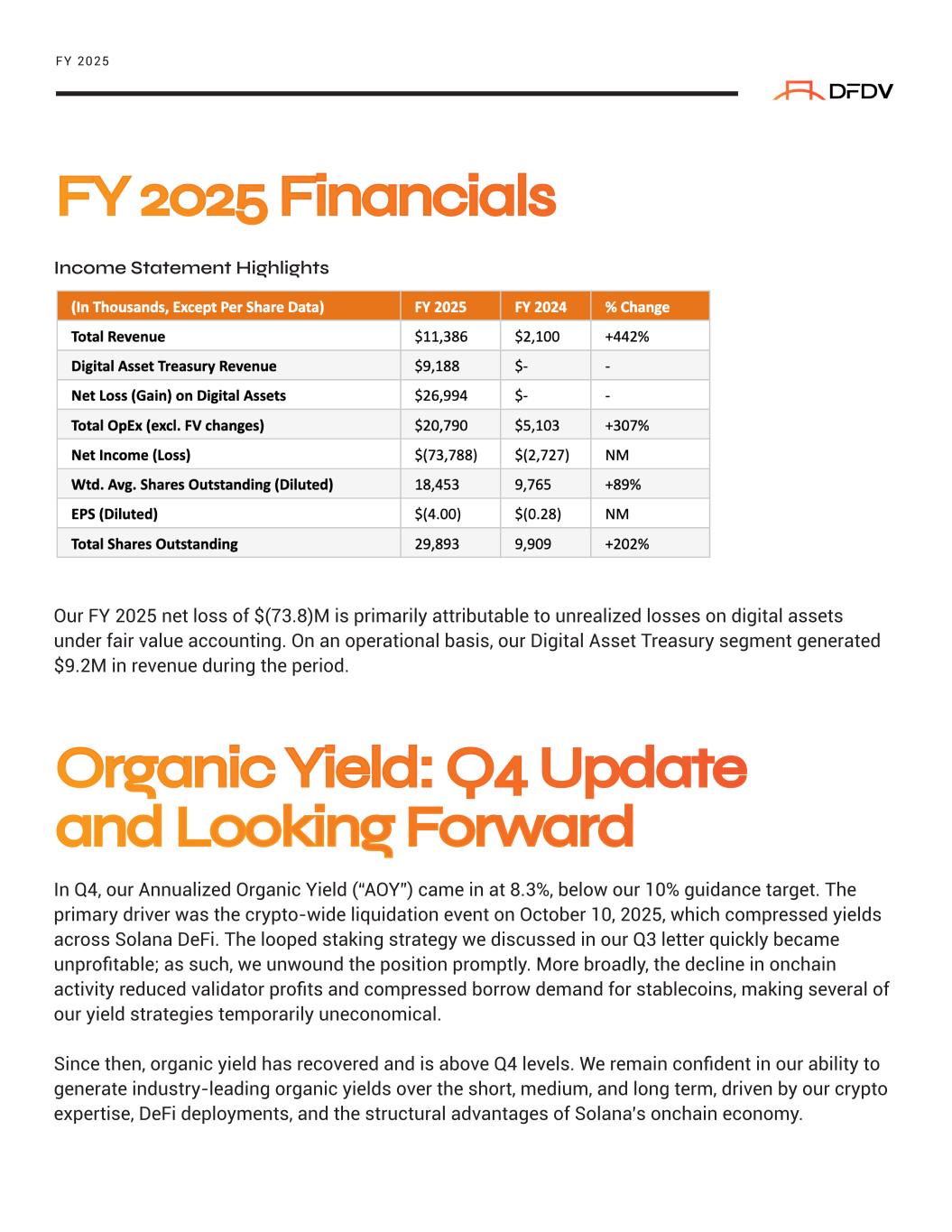 Income Statement Highlights Our FY 2025 net loss of $(73.8)M is primarily attributable to unrealized losses on digital assets under fair value accounting. On an operational basis, our Digital Asset Treasury segment generated $9.2M in revenue during the period. In Q4, our Annualized Organic Yield (“AOY”) came in at 8.3%, below our 10% guidance target. The primary driver was the crypto-wide liquidation event on October 10, 2025, which compressed yields across Solana DeFi. The looped staking strategy we discussed in our Q3 letter quickly became unprofitable; as such, we unwound the position promptly. More broadly, the decline in onchain activity reduced validator profits and compressed borrow demand for stablecoins, making several of our yield strategies temporarily uneconomical. Since then, organic yield has recovered and is above Q4 levels. We remain confident in our ability to generate industry-leading organic yields over the short, medium, and long term, driven by our crypto expertise, DeFi deployments, and the structural advantages of Solana’s onchain economy. FY 2025 Financials Organic Yield: Q4 Update and Looking Forward FY 2025