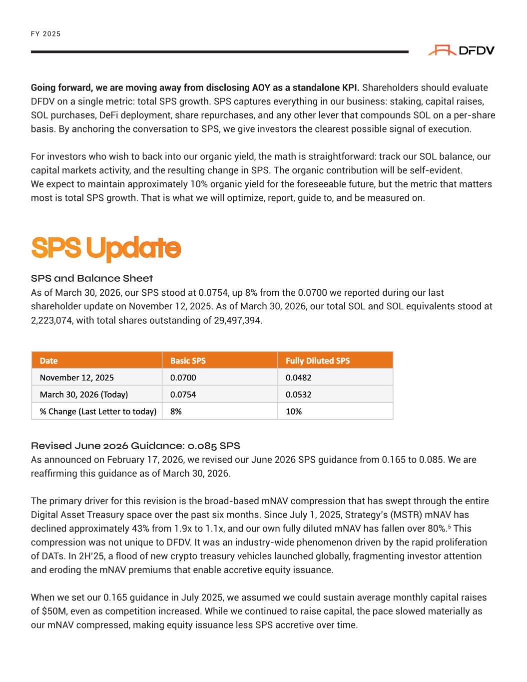 Revised June 2026 Guidance: 0.085 SPS As announced on February 17, 2026, we revised our June 2026 SPS guidance from 0.165 to 0.085. We are reaffirming this guidance as of March 30, 2026. The primary driver for this revision is the broad-based mNAV compression that has swept through the entire Digital Asset Treasury space over the past six months. Since July 1, 2025, Strategy’s (MSTR) mNAV has declined approximately 43% from 1.9x to 1.1x, and our own fully diluted mNAV has fallen over 80%.5 This compression was not unique to DFDV. It was an industry-wide phenomenon driven by the rapid proliferation of DATs. In 2H’25, a flood of new crypto treasury vehicles launched globally, fragmenting investor attention and eroding the mNAV premiums that enable accretive equity issuance. When we set our 0.165 guidance in July 2025, we assumed we could sustain average monthly capital raises of $50M, even as competition increased. While we continued to raise capital, the pace slowed materially as our mNAV compressed, making equity issuance less SPS accretive over time. FY 2025 Going forward, we are moving away from disclosing AOY as a standalone KPI. Shareholders should evaluate DFDV on a single metric: total SPS growth. SPS captures everything in our business: staking, capital raises, SOL purchases, DeFi deployment, share repurchases, and any other lever that compounds SOL on a per-share basis. By anchoring the conversation to SPS, we give investors the clearest possible signal of execution. For investors who wish to back into our organic yield, the math is straightforward: track our SOL balance, our capital markets activity, and the resulting change in SPS. The organic contribution will be self-evident. We expect to maintain approximately 10% organic yield for the foreseeable future, but the metric that matters most is total SPS growth. That is what we will optimize, report, guide to, and be measured on. SPS Update SPS and Balance Sheet As of March 30, 2026, our SPS stood at 0.0754, up 8% from the 0.0700 we reported during our last shareholder update on November 12, 2025. As of March 30, 2026, our total SOL and SOL equivalents stood at 2,223,074, with total shares outstanding of 29,497,394.