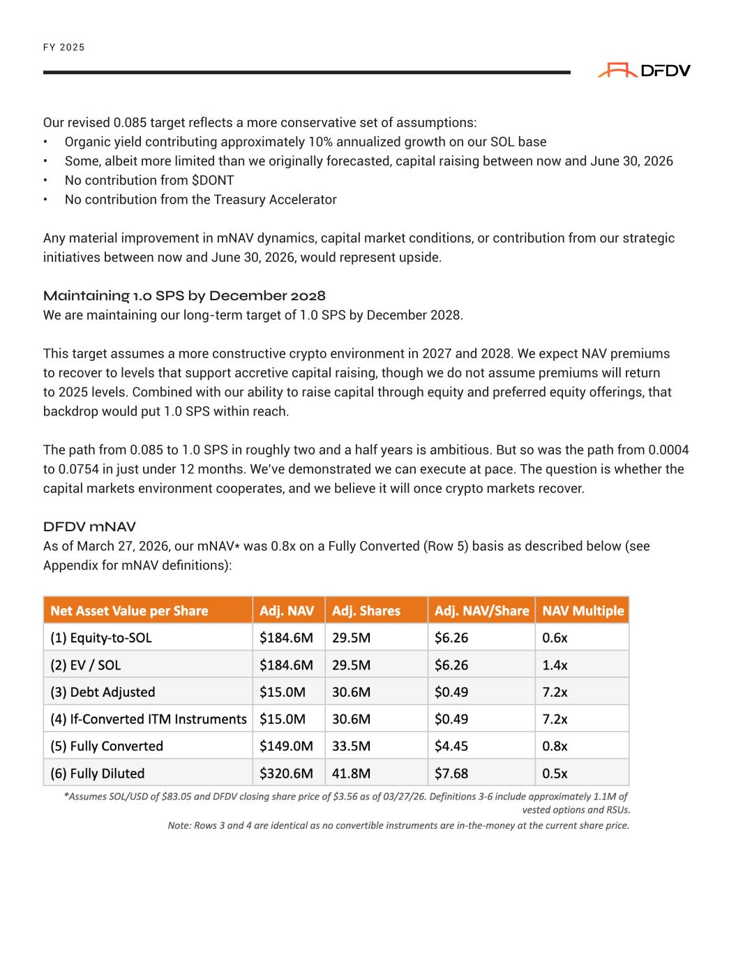 Our revised 0.085 target reflects a more conservative set of assumptions: • Organic yield contributing approximately 10% annualized growth on our SOL base • Some, albeit more limited than we originally forecasted, capital raising between now and June 30, 2026 • No contribution from $DONT • No contribution from the Treasury Accelerator Any material improvement in mNAV dynamics, capital market conditions, or contribution from our strategic initiatives between now and June 30, 2026, would represent upside. Maintaining 1.0 SPS by December 2028 We are maintaining our long-term target of 1.0 SPS by December 2028. This target assumes a more constructive crypto environment in 2027 and 2028. We expect NAV premiums to recover to levels that support accretive capital raising, though we do not assume premiums will return to 2025 levels. Combined with our ability to raise capital through equity and preferred equity offerings, that backdrop would put 1.0 SPS within reach. The path from 0.085 to 1.0 SPS in roughly two and a half years is ambitious. But so was the path from 0.0004 to 0.0754 in just under 12 months. We’ve demonstrated we can execute at pace. The question is whether the capital markets environment cooperates, and we believe it will once crypto markets recover. DFDV mNAV As of March 27, 2026, our mNAV* was 0.8x on a Fully Converted (Row 5) basis as described below (see Appendix for mNAV definitions): FY 2025